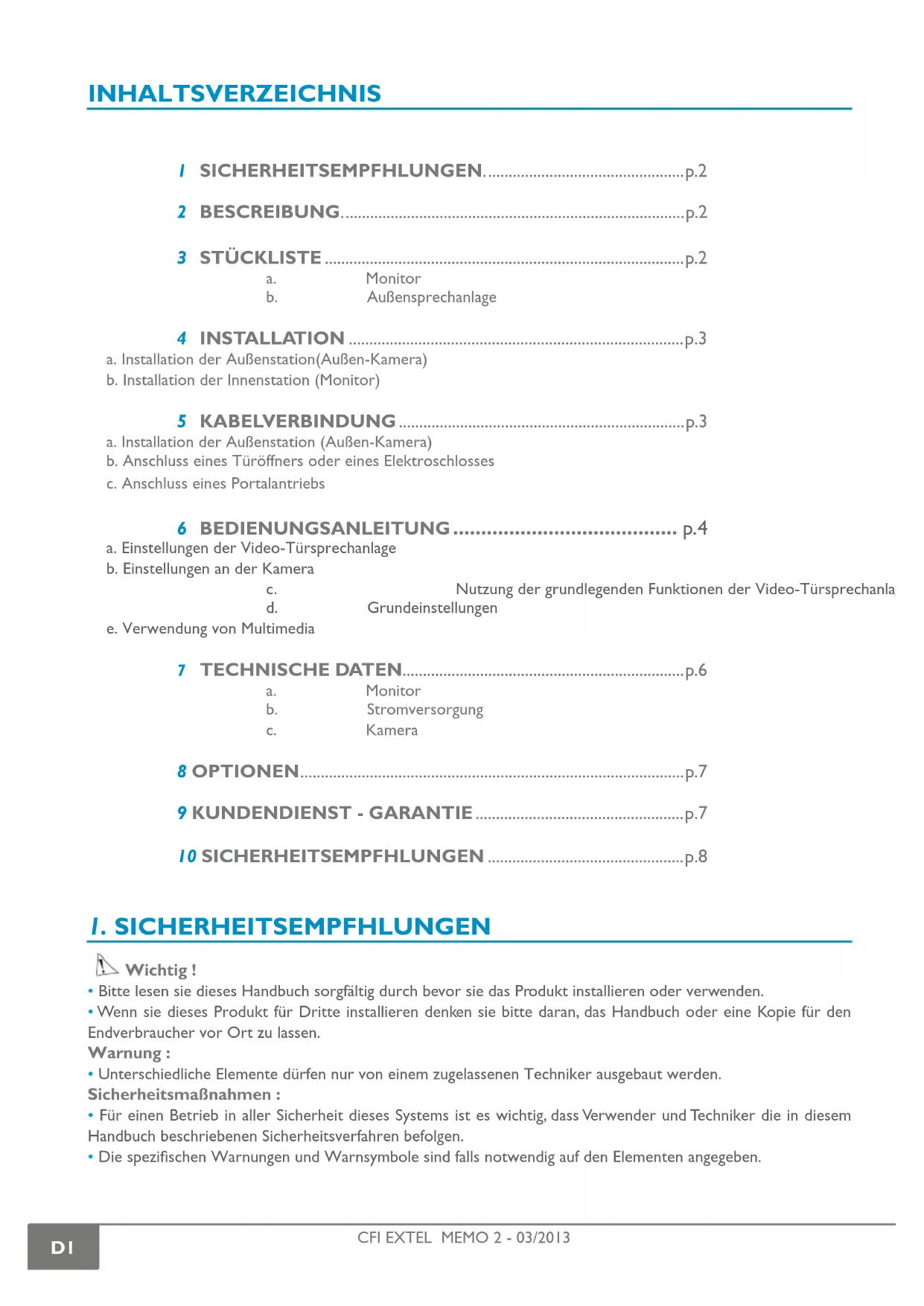 INHALTSVERZEICHNIS 1 SICHERHEITSEMPFHLUNGEN..................................................p.2 2 BESCREIBUNG.....................................................................................p.2 3 STÜCKLISTE ........................................................................................p.2 a. Monitor b. Außensprechanlage 4 INSTALLATION ..................................................................................p.3 a. Installation der Außenstation(Außen-Kamera) b. Installation der Innenstation (Monitor) 5 KABELVERBINDUNG ......................................................................p.3 a. Installation der Außenstation (Außen-Kamera) b. Anschluss eines Türöffners oder eines Elektroschlosses c. Anschluss eines Portalantriebs 6 BEDIENUNGSANLEITUNG ........................................ p.4 a. Einstellungen der Video-Türsprechanlage b. Einstellungen an der Kamera c. Nutzung der grundlegenden Funktionen der Video-Türsprechanlage d. Grundeinstellungen e. Verwendung von Multimedia 7 TECHNISCHE DATEN .....................................................................p.6 a. Monitor b. Stromversorgung c. Kamera 8 OPTIONEN ..............................................................................................p.7 9 KUNDENDIENST - GARANTIE ...................................................p.7 10 SICHERHEITSEMPFHLUNGEN ................................................p.8