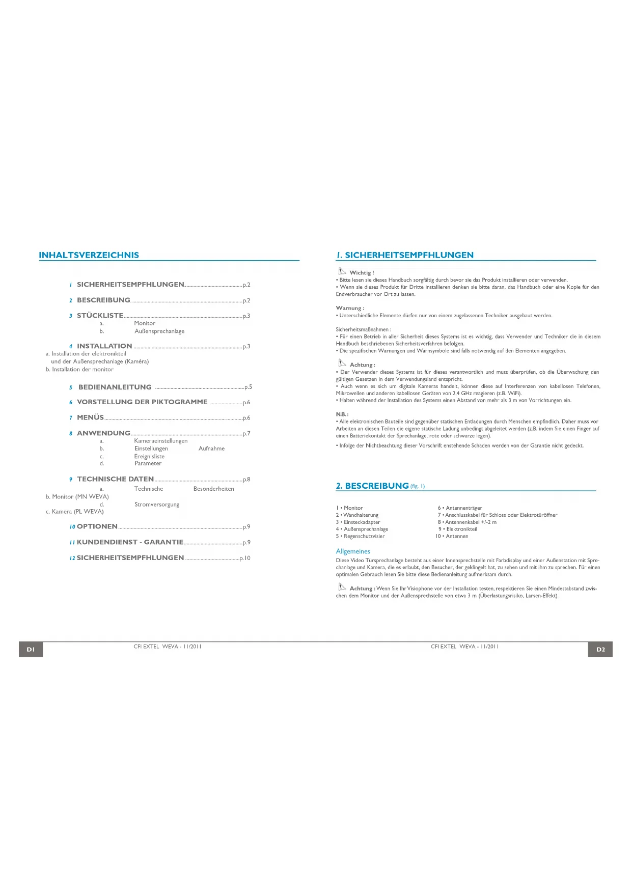 (fig. 1) 1 • Monitor 6 • Antennenträger 2 • Wandhalterung 7 • Anschlusskabel für Schloss oder Elektrotüröffner 3 • Einsteckadapter 8 • Antennenkabel +/-2 m 4 • Außensprechanlage 9 • Elektronikteil 5 • Regenschutzvisier 10 • Antennen Allgemeines Diese Video Türsprechanlage besteht aus einer Innensprechstelle mit Farbdisplay und einer Außenstation mit Spre- chanlage und Kamera, die es erlaubt, den Besucher, der geklingelt hat, zu sehen und mit ihm zu sprechen. Für einen optimalen Gebrauch lesen Sie bitte diese Bedienanleitung aufmerksam durch. Achtung : Wenn Sie Ihr Visiophone vor der Installation testen, respektieren Sie einen Mindestabstand zwis- chen dem Monitor und der Außensprechstelle von etwa 3 m (Überlastungsrisiko, Larsen-Effekt).CFI EXTEL WEVA - 11/2011