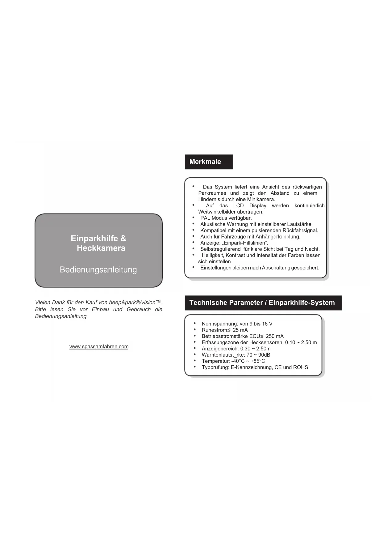 - Typprüfung: E-Kennzeichnung, CE und ROHS Merkmale Technische Parameter / Einparkhilfe-System www.spassamfahren.com Beep&Park_Vision-2011.indd 27 29/12/11 10:2428 29