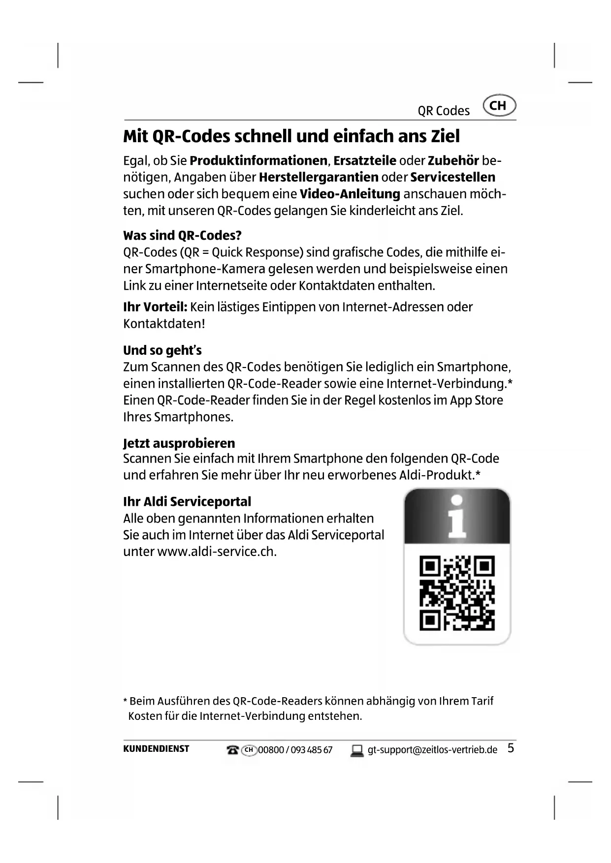 Mit QR-Codes schnell und einfach ans Ziel Egal, ob Sie Produktinformationen, Ersatzteile oder Zubehör be- nötigen, Angaben über Herstellergarantien oder Servicestellen suchen oder sich bequem eine Video-Anleitung anschauen möch- ten, mit unseren QR-Codes gelangen Sie kinderleicht ans Ziel.Was sind QR-Codes?QR-Codes (QR = Quick Response) sind grafische Codes, die mithilfe ei-ner Smartphone-Kamera gelesen werden und beispielsweise einen Link zu einer Internetseite oder Kontaktdaten enthalten.Ihr Vorteil: Kein lästiges Eintippen von Internet-Adressen oder Kontaktdaten!Und so geht’sZum Scannen des QR-Codes benötigen Sie lediglich ein Smartphone, einen installierten QR-Code-Reader sowie eine Internet-Verbindung.* Einen QR-Code-Reader finden Sie in der Regel kostenlos im App Store Ihres Smartphones.Jetzt ausprobierenScannen Sie einfach mit Ihrem Smartphone den folgenden QR-Code und erfahren Sie mehr über Ihr neu erworbenes Aldi-Produkt.*Ihr Aldi ServiceportalAlle oben genannten Informationen erhalten Sie auch im Internet über das Aldi Serviceportal unter www.aldi-service.ch.* Beim Ausführen des QR-Code-Readers können abhängig von Ihrem Tarif Kosten für die Internet-Verbindung entstehen.Allgemeines