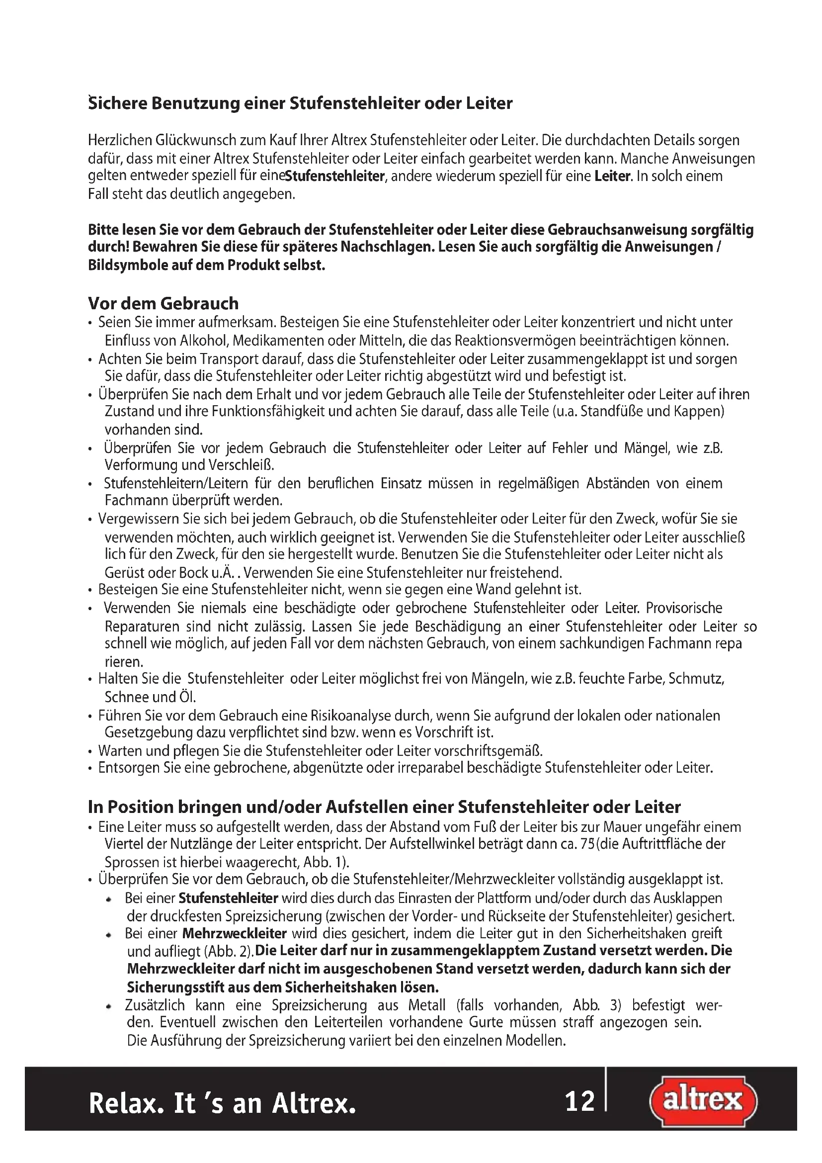 gehen, dann werden Ihnen die Untersuchungskosten in Rechnung gestellt. b) Wünscht der Kunde eine Untersuchung durch ein unabhängiges Institut, dann sind die Kosten dieser Untersuchung für Rechnung des Kunden, wenn daraus ein unsachgemäßer Gebrauch des Produktes hervorgeht. Die Kosten der Untersuchung sind auch für Rechnung des Kunden, wenn Altrex vor der Durchführung einer solchen Untersuchung angeboten hat, das Produkt auf ihre Rechnung zu reparieren oder zu ersetzen.Relax. It ’s an Altrex.