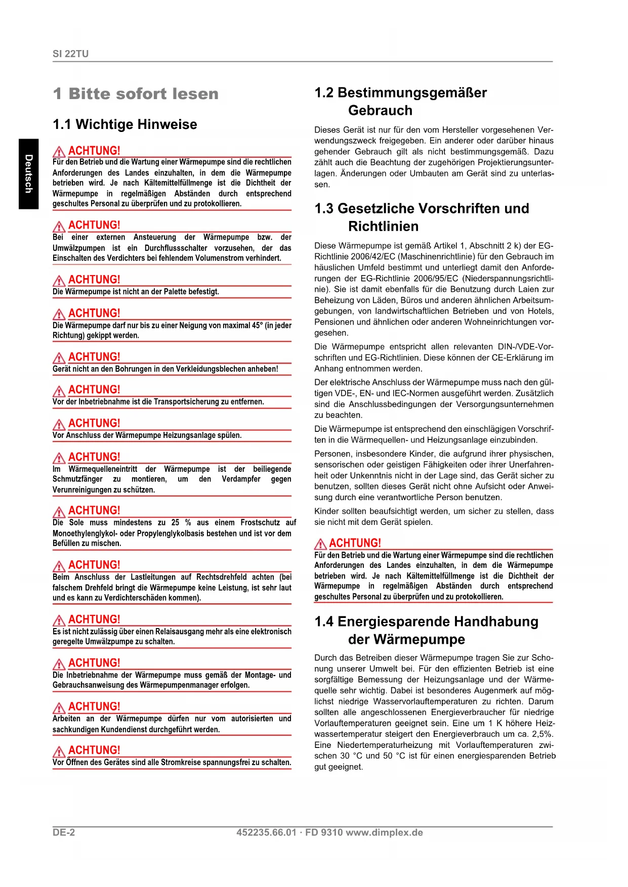 der Wärmepumpe Durch das Betreiben dieser Wärmepumpe tragen Sie zur Scho- nung unserer Umwelt bei. Für den effizienten Betrieb ist eine sorgfältige Bemessung der Heizungsanlage und der Wärme- quelle sehr wichtig. Dabei ist besonderes Augenmerk auf mög- lichst niedrige Wasservorlauftemperaturen zu richten. Darum sollten alle angeschlossenen Energieverbraucher für niedrige Vorlauftemperaturen geeignet sein. Eine um 1 K höhere Heiz- wassertemperatur steigert den Energieverbrauch um ca. 2,5%. Eine Niedertemperaturheizung mit Vorlauftemperaturen zwi- schen 30 °C und 50 °C ist für einen energiesparenden Betrieb gut geeignet.www.dimplex.de 452235.66.01 · FD 9310 DE-3 Deutsch SI 22TU 2 Verwendungszweck der Wärmepumpe