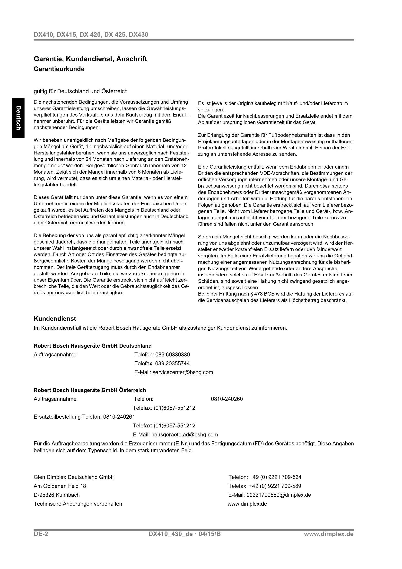 ACHTUNG! Der an der Rückseite des Gerätes mitgelieferte Orginal-Wandhalter muss verwendet werden. Entfernen Sie den Wandhalter von der Rückseite des Gerätes durch Drücken der Feder an jeder Seite. Befestigungslöcher bohren. Achten Sie hierbei auf sich in der Wand befindliche Elek- tro- und Rohrleitungen! Den Wandhalter mit den beiliegenden Schrauben fest an der Wand verschrauben. Hängen Sie das Gerät in die unteren Schlitze der Wandhalterung ein. Bringen Sie das Gerät in eine aufrechte Position und drücken Sie das Gerät zur Verriegelung in die Federn bis diese einrasten. Typ Leistung (W) Breite (mm) Höhe (mm) Tiefe (mm) Ge- wicht DX 410 1000 575 350 124 4,1 kg DX 415 1500 575 350 124 4,1 kg DX 420 2000 575 350 124 4,1 kg DX425 2500 695 350 124 4,8 kg DX 430 3000 695 350 124 4,8 kg Typ Leistung (W) A (mm) DX 410 1000 354 DX 415 1500 354 DX 420 2000 354 DX 425 2500 476 DX 430 3000 476www.dimplex.de DX410_430_de · 04/15/B DE-5 Deutsch DX410, DX415, DX 420, DX 425, DX430 4 Elektrischer Anschluss Die Spannungsangabe auf dem Typschild muss mit der vorhandenen Netzspannung übereinstimmen. Die Heizgeräte sind mit einer Geräteanschlussleitung ohne Stecker versehen. Die Geräteanschlussleitung muss an eine für das Heizgerät bestimmte Anschluss- dose angeschlossen werden. Die Geräteanschlussdose muss jederzeit zugänglich sein. 5 Betrieb Die Raumtemperatur wird über den stufenlos einstell- baren Thermostaten (C) geregelt. Wird der Drehknopf auf die kleinste Einstellung ganz nach links gestellt (siehe Bild) schaltet der Thermostat bei etwa 5 °C Um- gebungstemperatur das Heizgerät ein. Mit dem Netzschalter (D) wird das Heizgerät ein- oder ausgeschaltet. Mit dem Schalter Betriebsart (E) kann zwischen zwei Heizstufen (I = 1000 W oder II = 2000 W) gewählt wer- den. Wenn das Gerät heizt, leuchtet die rote Lampe. ACHTUNG! Je nach Raumgröße, Wärmebedarf und Thermo- stateinstellung können Räume bei unbeaufsichtigter Beheizung überheizt werden. Dies kann zu Gefahren für Personen führen, die nicht in der Lage sind, den Raum bei überhöhter Temperatur zu verlassen. Glen Dimplex Deutschland GmbH Am Goldenen Feld 18 D-95326 Kulmbach Technische Änderungen vorbehalten 6 Überhitzungsschutz Bei unzulässiger Erwärmung wird das Heizgerät auto- matisch abgeschaltet. In diesem Fall Netzstecker zie- hen und Gerät für einige Minuten ausgesteckt lassen, damit der Temperaturbegrenzer wieder zurückschalten kann. Anschließend mögliche Ursache beseitigen, z.B. Luft- gitter verstellt oder abgedeckt. Wenn das Gerät ausrei- chend abgekühlt ist, kann es wieder in Betrieb genom- men werden. 7 Störungen Wenn das Heizgerät keine Wärme abgibt, prüfen Sie bitte, ob das Gerät eingeschaltet ist und der Thermos- tat auf die gewünschte Temperatur eingestellt ist, so- dann ob der Automat in der Stromverteilung einge- schaltet bzw. die Sicherung in Ordnung ist. Kann die Störung nicht behoben werden, wenden Sie sich bitte an die nächstgelegene Kundendienststelle. Für die Auftragsbearbeitung werden die E-Nummer und FD-Zahl des Gerätes benötigt. Diese Angaben fin- den Sie auf dem Typschild. Reparaturen und Eingriffe in das Gerät dürfen nur von einem Elektrofachmann oder dem Kundendienst aus- geführt werden. 8 Kundendienst Im Kundendienstfall ist die Robert Bosch Hausgeräte GmbH als zuständiger Kundendienst zu informieren. Die Kontaktdaten finden Sie auf Seite 2 unter „Garantie, Kundendienst, Anschrift“. 9 Reinigung Zur Reinigung muss das Gerät vom Netz getrennt und abgekühlt sein. Die Außenseite kann durch Abwischen mit einem weichen, feuchten Lappen gereinigt werden. Zur Reinigung keine Scheuerpulver oder Möbelpolitu- ren verwenden, da diese die Oberfläche beschädigen können. Staubansammlungen im Gerät können von außen mit einem Staubsauger abgesaugt werden. 10 Garantie Für dieses Produkt übernehmen wir 2 Jahre Garantie gemäß unseren Garantiebedingungen. 11 Entsorgungshinweis Das Gerät nicht im allgemeinen Hausmüll entsorgen, sondern einer örtlichen Entsor- gungsstelle zuführen. Telefon: +49 9221 709-564 Fax: +49 9221 709-589 E-Mail: 09221709589@dimplex.de www.dimplex.deEN-6 DX410_430_gb · 04/15/B www.dimplex.de/en English DX 410, DX 415, DX 420, DX 425, DX 430 1 Information for the user NOTENOTE Dear customer, To ensure safe operation, the heater may only be installed and connected in accordance with these installation and operating instructions. Read all information contained in this manual carefully. Keep these instructions in a safe place and pass them on to any new owner. ATTENTION! This appliance can be used by children aged from 8 years and above and persons with reduced physical, sensory or mental capabilities or lack of experience or knowledge if they have been given super- vision or instruction concerning the use of the appliance in a safe way and understand the hazards involved. Children shall not play with the appliance. Cleaning and user main- tenance shall not be made by children without supervision! ATTENTION! Children of less than 3 years should be kept away unless continuously supervised! ATTENTION! Children aged from 3 years and less than 8 years shall only switch on/off the appliance provided that it has been placed or installed in its intended normal operating position and they have been given supervision or instruction concerning the use of the appliance in a safe way and understand the hazards involved! ATTENTION! Children aged from 3 years and less than 8 years shall not plug in, regulate and clean the appliance or perform user maintenance! ATTENTION! Some parts of this product can become very hot and cause burns! Particular attention has to be given where children and vulnerable people are present! ATTENTION! If the supply cord is damaged, it must be replaced by the manufacturer, its service agent or similarly qualified persons in order to avoid a hazard! ATTENTION! The heater must not be located above or below a socket outlet! ATTENTIO