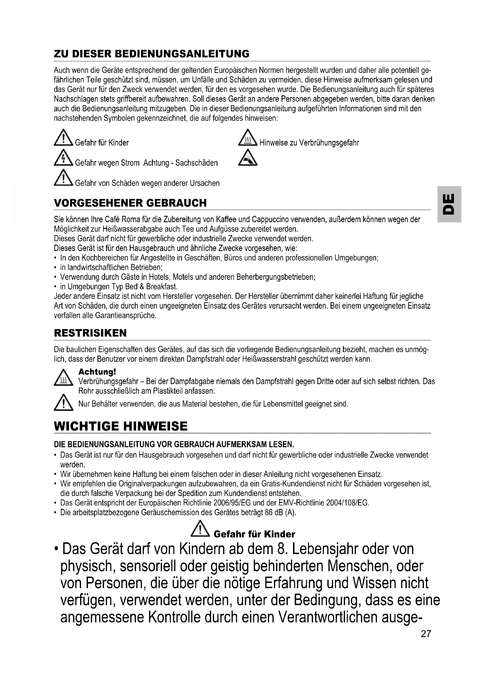 Auch wenn die Geräte entsprechend der geltenden Europäischen Normen hergestellt wurden und daher alle potentiell ge-fährlichen Teile geschützt sind, müssen, um Unfälle und Schäden zu vermeiden, diese Hinweise aufmerksam gelesen und das Gerät nur für den Zweck verwendet werden, für den es vorgesehen wurde. Die Bedienungsanleitung auch für späteres Nachschlagen stets griffbereit aufbewahren. Soll dieses Gerät an andere Personen abgegeben werden, bitte daran denken auch die Bedienungsanleitung mitzugeben. Die in dieser Bedienungsanleitung aufgeführten Informationen sind mit den nachstehenden Symbolen gekennzeichnet, die auf folgendes hinweisen: Gefahr für Kinder Hinweise zu Verbrühungsgefahr Gefahr wegen Strom Achtung - Sachschäden Gefahr von Schäden wegen anderer Ursachen Sie können Ihre Café Roma für die Zubereitung von Kaffee und Cappuccino verwenden, außerdem können wegen der Möglichkeit zur Heißwasserabgabe auch Tee und Aufgüsse zubereitet werden.Dieses Gerät darf nicht für gewerbliche oder industrielle Zwecke verwendet werden.Dieses Gerät ist für den Hausgebrauch und ähnliche Zwecke vorgesehen, wie:• In den Kochbereichen für Angestellte in Geschäften, Büros und anderen professionellen Umgebungen;• in landwirtschaftlichen Betrieben;• Verwendung durch Gäste in Hotels, Motels und anderen Beherbergungsbetrieben;• in Umgebungen Typ Bed & Breakfast.Jeder andere Einsatz ist nicht vom Hersteller vorgesehen. Der Hersteller übernimmt daher keinerlei Haftung für jegliche Art von Schäden, die durch einen ungeeigneten Einsatz des Gerätes verursacht werden. Bei einem ungeeigneten Einsatz verfallen alle Garantieansprüche. Die baulichen Eigenschaften des Gerätes, auf das sich die vorliegende Bedienungsanleitung bezieht, machen es unmög-lich, dass der Benutzer vor einem direkten Dampfstrahl oder Heißwasserstrahl geschützt werden kann. Verbrühungsgefahr – Bei der Dampfabgabe niemals den Dampfstrahl gegen Dritte oder auf sich selbst richten. Das Rohr ausschließlich am Plastikteil anfassen.Nur Behälter verwenden, die aus Material bestehen, die für Lebensmittel geeignet sind. die BedienungsanLeitung vor geBrauCh auFmerksam Lesen.• Das Gerät ist nur für den Hausgebrauch vorgesehen und darf nicht für gewerbliche oder industrielle Zwecke verwendet werden.• Wir übernehmen keine Haftung bei einem falschen oder in dieser Anleitung nicht vorgesehenen Einsatz.• Wir empfehlen die Originalverpackungen aufzubewahren, da ein Gratis-Kundendienst nicht für Schäden vorgesehen ist, die durch falsche Verpackung bei der Spedition zum Kundendienst entstehen. • Das Gerät entspricht der Europäischen Richtlinie 2006/95/EG und der EMV-Richtlinie 2004/108/EG.• Die arbeitsplatzbezogene Geräuschemission des Gerätes beträgt 86 dB (A).