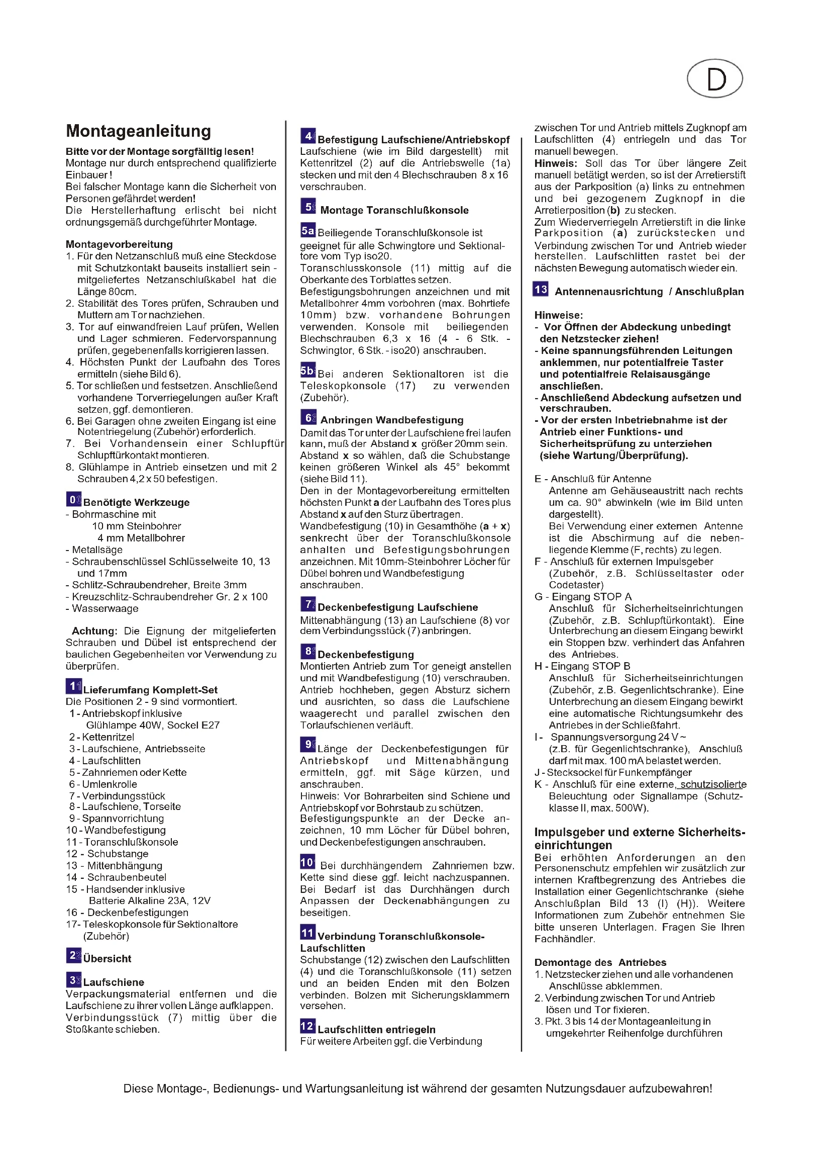 3 sec.Befestigung Laufschiene/AntriebskopfLaufschiene (wie im Bild dargestellt) mit Kettenritzel (2) auf die Antriebswelle (1a) stecken und mit den 4 Blechschrauben 8 x 16 verschrauben. Montage Toranschlußkonsole Beiliegende Toranschlußkonsole ist geeignet für alle Schwingtore und Sektional-tore vom Typ iso20. Toranschlusskonsole (11) mittig auf die Oberkante des Torblattes setzen.Befestigungsbohrungen anzeichnen und mit Metallbohrer 4mm vorbohren (max. Bohrtiefe 10mm) bzw. vorhandene Bohrungen verwenden. Konsole mit beiliegenden Blechschrauben 6,3 x 16 (4 - 6 Stk. - Schwingtor, 6 Stk. - iso20) anschrauben. Bei anderen Sektionaltoren ist die Teleskopkonsole (17) zu verwenden (Zubehör). Anbringen WandbefestigungDamit das Tor unter der Laufschiene frei laufen kann, muß der Abstand x größer 20mm sein. Abstand x so wählen, daß die Schubstange keinen größeren Winkel als 45° bekommt (siehe Bild 11).Den in der Montagevorbereitung ermittelten höchsten Punkt a der Laufbahn des Tores plus Abstand x auf den Sturz übertragen.Wandbefestigung (10) in Gesamthöhe (a + x) senkrecht über der Toranschlußkonsole anhalten und Befestigungsbohrungen anzeichnen. Mit 10mm-Steinbohrer Löcher für Dübel bohren und Wandbefestigunganschrauben. Deckenbefestigung LaufschieneMittenabhängung (13) an Laufschiene (8) vor dem Verbindungsstück (7) anbringen. DeckenbefestigungMontierten Antrieb zum Tor geneigt anstellen und mit Wandbefestigung (10) verschrauben. Antrieb hochheben, gegen Absturz sichern und ausrichten, so dass die Laufschiene waagerecht und parallel zwischen den Torlaufschienen verläuft. Länge der Deckenbefestigungen für Antriebskopf und Mittenabhängung ermitteln, ggf. mit Säge kürzen, und anschrauben. Hinweis: Vor Bohrarbeiten sind Schiene und Antriebskopf vor Bohrstaub zu schützen.Befestigungspunkte an der Decke an- zeichnen, 10 mm Löcher für Dübel bohren, und Deckenbefestigungen anschrauben. Bei durchhängendem Zahnriemen bzw. Kette sind diese ggf. leicht nachzuspannen. Bei Bedarf ist das Durchhängen durch Anpassen der Deckenabhängungen zu beseitigen. Verbindung Toranschlußkonsole- LaufschlittenSchubstange (12) zwischen den Laufschlitten (4) und die Toranschlußkonsole (11) setzen und an beiden Enden mit den Bolzen verbinden. Bolzen mit Sicherungsklammern versehen. Laufschlitten entriegelnFür weitere Arbeiten ggf. die VerbindungBitte vor der Montage sorgfälltig lesen! Montage nur durch entsprechend qualifizierte Einbauer !Bei falscher Montage kann die Sicherheit von Personen gefährdet werden! Die Herstellerhaftung erlischt bei nicht ordnungsgemäß durchgeführter Montage.Montagevorbereitung1. Für den Netzanschluß muß eine Steckdose mit Schutzkontakt bauseits installiert sein - mitgeliefertes Netzanschlußkabel hat die Länge 80cm.2. Stabilität des Tores prüfen, Schrauben und Muttern am Tor nachziehen.3. Tor auf einwandfreien Lauf prüfen, Wellen und Lager schmieren. Federvorspannung prüfen, gegebenenfalls korrigieren lassen.4. Höchsten Punkt der Laufbahn des Tores ermitteln (siehe Bild 6).5. Tor schließen und festsetzen. Anschließend vorhandene Torverriegelungen außer Kraft setzen, ggf. demontieren.6. Bei Garagen ohne zweiten Eingang ist eine Notentriegelung (Zubehör) erforderlich. 7. Bei Vorhandensein einer Schlupftür Schlupftürkontakt montieren.8. Glühlampe in Antrieb einsetzen und mit 2 Schrauben 4,2 x 50 befestigen. Benötigte Werkzeuge- Bohrmaschine mit 10 mm Steinbohrer 4 mm Metallbohrer- Metallsäge- Schraubenschlüssel Schlüsselweite 10, 13 und 17mm- Schlitz-Schraubendreher, Breite 3mm- Kreuzschlitz-Schraubendreher Gr. 2 x 100- Wasserwaage Achtung: Die Eignung der mitgelieferten Schrauben und Dübel ist entsprechend der baulichen Gegebenheiten vor Verwendung zu überprüfen. Lieferumfang Komplett-SetDie Positionen 2 - 9 sind vormontiert. 1 - Antriebskopf inklusive Glühlampe 40W, Sockel E27 2 - Kettenritzel 3 - Laufschiene, Antriebsseite 4 - Laufschlitten 5 - Zahnriemen oder Kette 6 - Umlenkrolle 7 - Verbindungsstück 8 - Laufschiene, Torseite 9 - Spannvorrichtung10 - Wandbefestigung11 - Toranschlußkonsole12 - Schubstange13 - Mittenbhängung14 - Schraubenbeutel15 - Handsender inklusive Batterie Alkaline 23A, 12V16 - Deckenbefestigungen17- Teleskopkonsole für Sektionaltore (Zubehör) Übersicht LaufschieneVerpackungsmaterial entfernen und die Laufschiene zu ihrer vollen Länge aufklappen.Verbindungsstück (7) mittig über die Stoßkante schieben.