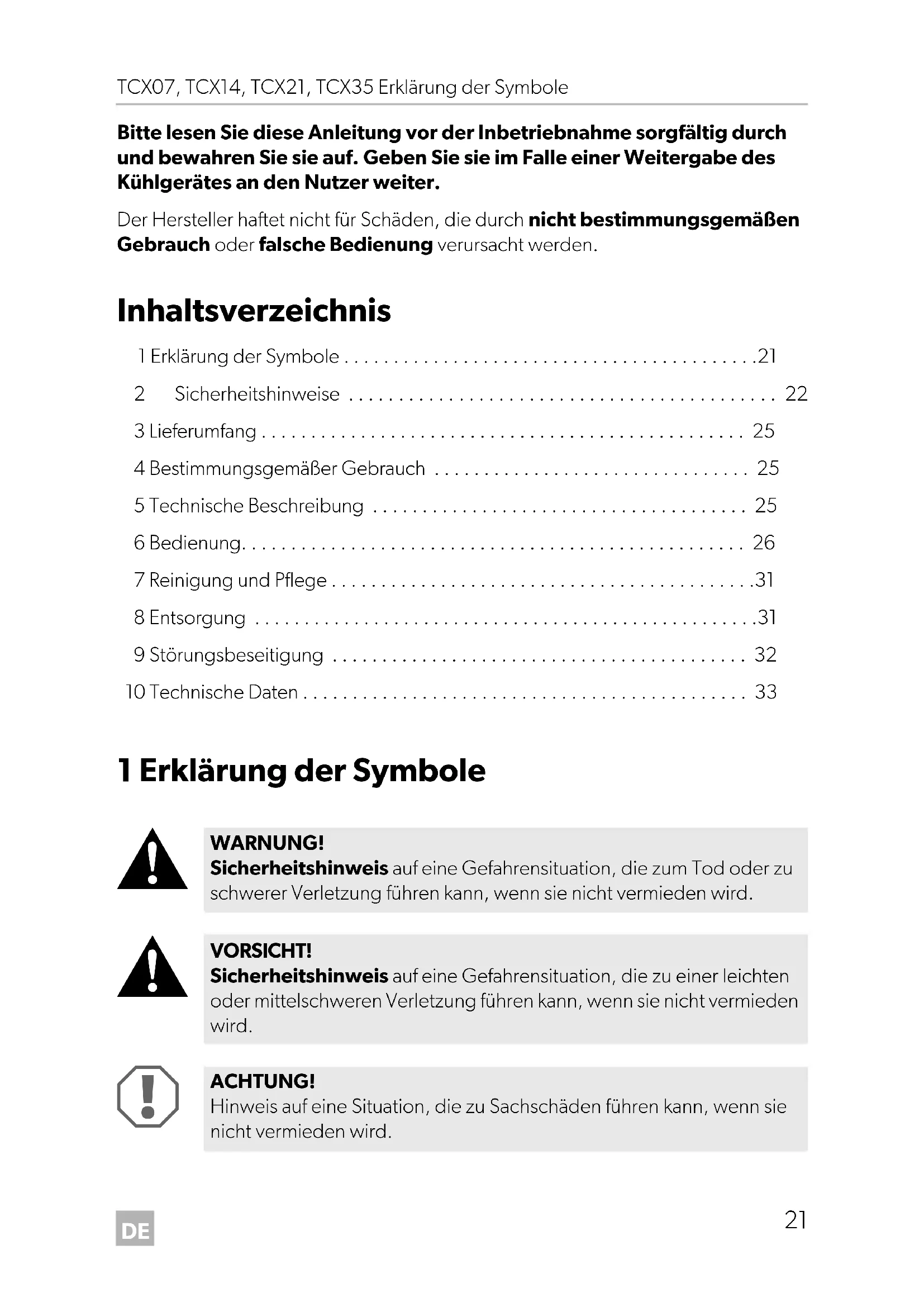 - Bitte lesen Sie diese Anleitung vor der Inbetriebnahme sorgfältig durch und bewahren Sie sie auf. Geben Sie sie im Falle einer Weitergabe des Kühlgerätes an den Nutzer weiter. Der Hersteller haftet nicht für Schäden, die durch nicht bestimmungsgemäßen Gebrauch oder falsche Bedienung verursacht werden. Inhaltsverzeichnis 1 Erklärung der Symbole p. 21