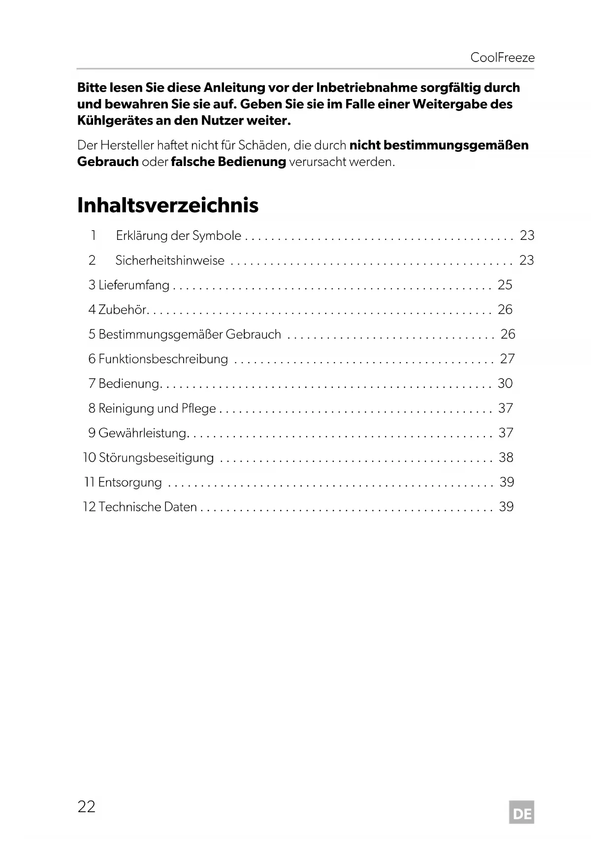 - Bitte lesen Sie diese Anleitung vor der Inbetriebnahme sorgfältig durch und bewahren Sie sie auf. Geben Sie sie im Falle einer Weitergabe des Kühlgerätes an den Nutzer weiter. Der Hersteller haftet nicht für Schäden, die durch nicht bestimmungsgemäßen Gebrauch oder falsche Bedienung verursacht werden. Inhaltsverzeichnis 1 Erklärung der Symbole p. 23