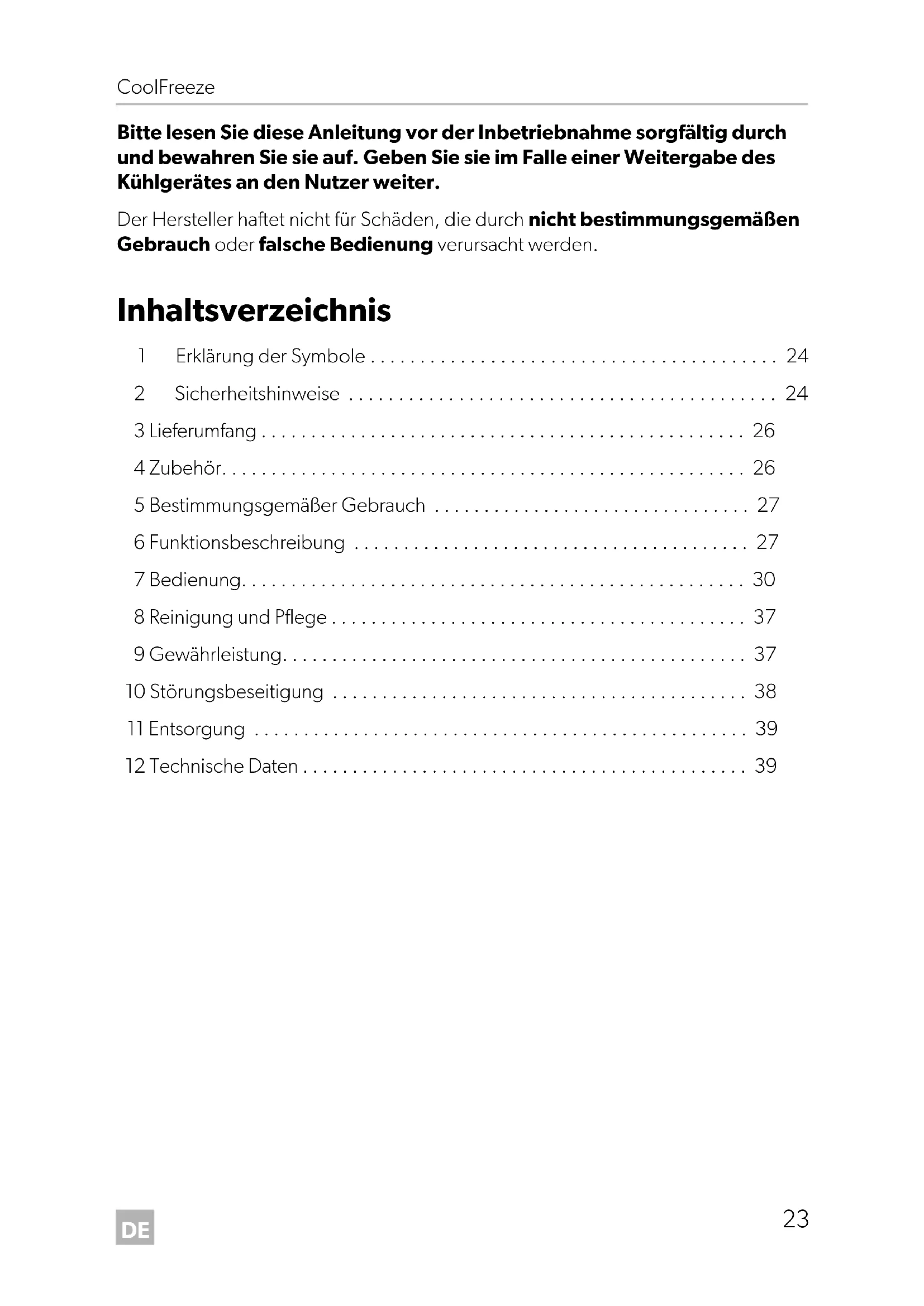 - Bitte lesen Sie diese Anleitung vor der Inbetriebnahme sorgfältig durch und bewahren Sie sie auf. Geben Sie sie im Falle einer Weitergabe des Kühlgerätes an den Nutzer weiter. Der Hersteller haftet nicht für Schäden, die durch nicht bestimmungsgemäßen Gebrauch oder falsche Bedienung verursacht werden. Inhaltsverzeichnis 1 Erklärung der Symbole p. 24