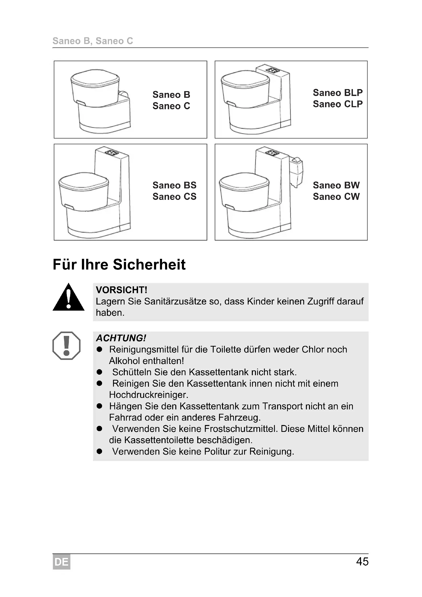 VORSICHT! Lagern Sie Sanitärzusätze so, dass Kinder keinen Zugriff darauf haben.ACHTUNG! Reinigungsmittel für die Toilette dürfen weder Chlor noch Alkohol enthalten! Schütteln Sie den Kassettentank nicht stark. Reinigen Sie den Kassettentank innen nicht mit einem Hochdruckreiniger. Hängen Sie den Kassettentank zum Transport nicht an ein Fahrrad oder ein anderes Fahrzeug. Verwenden Sie keine Frostschutzmittel. Diese Mittel können die Kassettentoilette beschädigen. Verwenden Sie keine Politur zur Reinigung. Saneo B Saneo C Saneo BLP Saneo CLP Saneo BS Saneo CS Saneo BW Saneo CWDE Saneo B, Saneo C