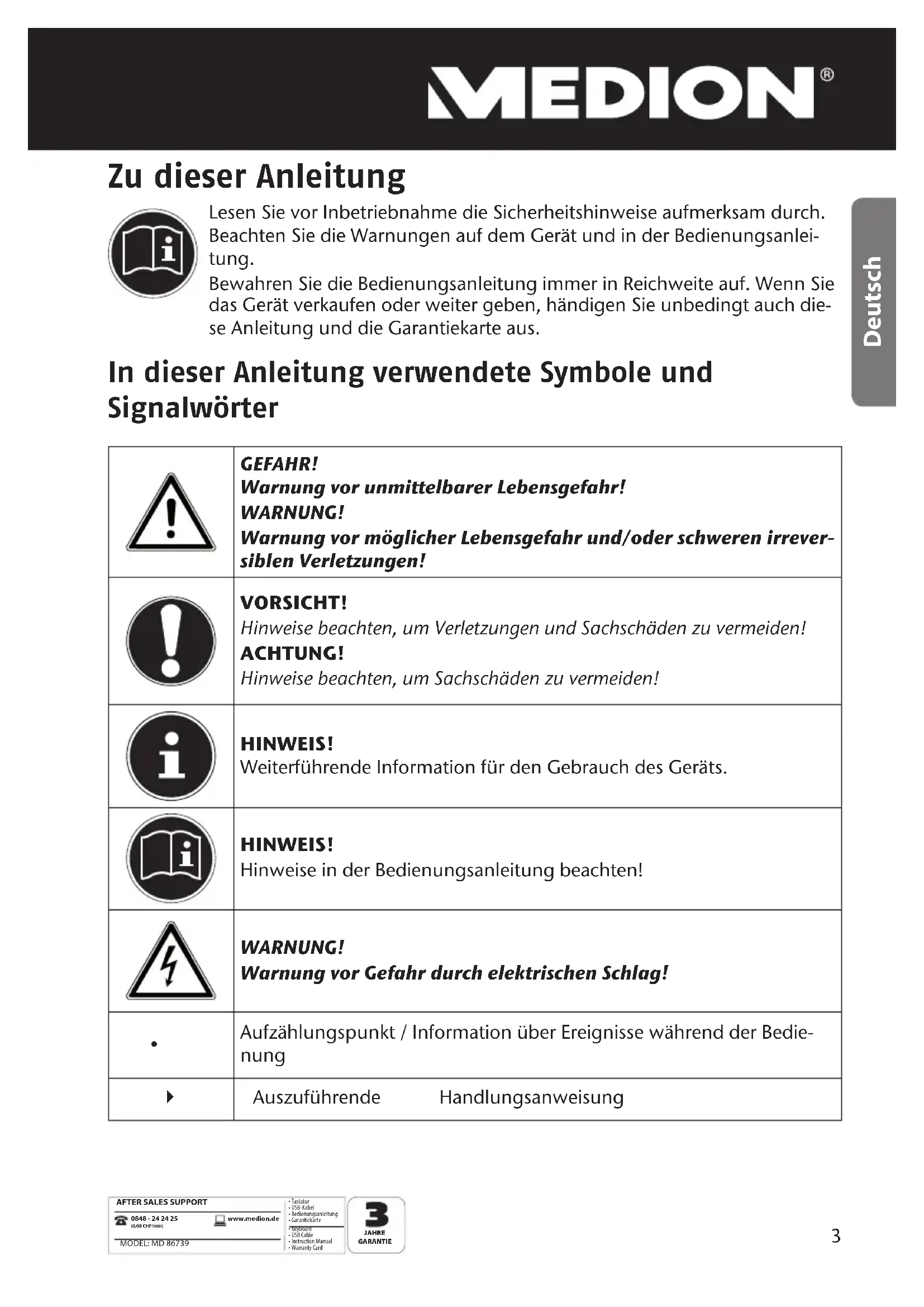 www.medion.de 0848 - 24 24 25 (0,08 CHF/min) MODEL: MD 86739 t5BTUBUVS t64#,BCFM t#FEJFOVOHTBOMFJUVOH t(BSBOUJFLBSUF JAHRE GARANTIE t,FZCPBSE t64#$BCMF t*OTUSVDUJPO.BOVBM t8BSSBOUZ$BSE 86739 DE Hofer Content Final.indd 286739 DE Hofer Content Final.indd 2 14.08.2012 16:45:3214.08.2012 16:45:323 AFTER SALES SUPPORTwww.medion.de0848 - 24 24 25(0,08 CHF/min) MODEL: MD 86739t5BTUBUVSt64#,BCFMt#FEJFOVOHTBOMFJUVOHt(BSBOUJFLBSUFJAHRE GARANTIE t,FZCPBSEt64#$BCMFt*OTUSVDUJPO.BOVBMt8BSSBOUZ$BSE Deutsch Zu dieser Anleitung Lesen Sie vor Inbetriebnahme die Sicherheitshinweise aufmerksam durch. Beachten Sie die Warnungen auf dem Gerät und in der Bedienungsanlei- tung. Bewahren Sie die Bedienungsanleitung immer in Reichweite auf. Wenn Sie das Gerät verkaufen oder weiter geben, händigen Sie unbedingt auch die- se Anleitung und die Garantiekarte aus. In dieser Anleitung verwendete Symbole und Signalwörter GEFAHR! Warnung vor unmittelbarer Lebensgefahr! WARNUNG! Warnung vor möglicher Lebensgefahr und/oder schweren irrever- siblen Verletzungen! VORSICHT! Hinweise beachten, um Verletzungen und Sachschäden zu vermeiden! ACHTUNG! Hinweise beachten, um Sachschäden zu vermeiden! HINWEIS! Weiterführende Information für den Gebrauch des Geräts. HINWEIS! Hinweise in der Bedienungsanleitung beachten! WARNUNG! Warnung vor Gefahr durch elektrischen Schlag!