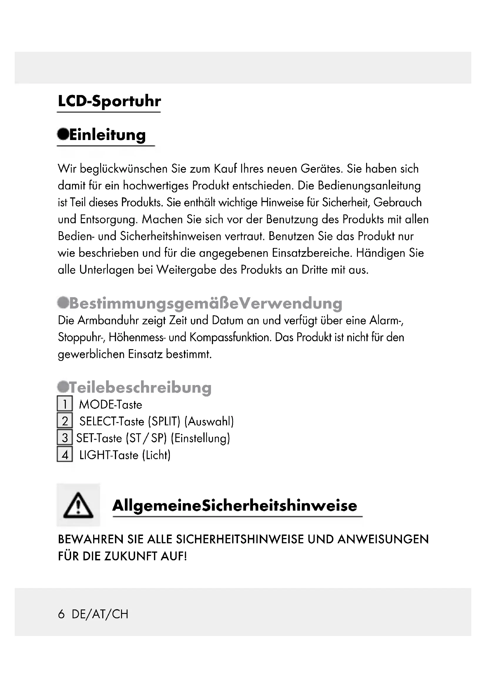 25 DE/AT/CH Einleitung Bestimmungsgemäße Verwendung .........................................Seite 6 Teilebeschreibung .....................................................................Seite 6 Allgemeine Sicherheitshinweise .....................Seite 6 Sicherheitshinweise zu Batterien...................Seite 7 Wasserdichtigkeit ......................................................... Seite 8 Inbetriebnahme Batterie wechseln ......................................................................Seite 8 Bedienung Zeit-Modus ................................................................................Seite 8 Alarm .........................................................................................Seite 10 Stoppuhr-Modus .......................................................................Seite 14 Kompass-Modus .......................................................................Seite 17 Höhenmesser-Modus ................................................................ Seite 21 Hintergrund-Kontrastbeleuchtung ............................................Seite 26 Fehlerquellen ............................................................................. Seite 26 Reinigung und Pflege ................................................ Seite 26 Entsorgung...........................................................................Seite 26 Garantie ................................................................................. Seite 276 DE/AT/CH LCD-Sportuhr Einleitung Wir beglückwünschen Sie zum Kauf Ihres neuen Gerätes. Sie haben sich damit für ein hochwertiges Produkt entschieden. Die Bedienungsanleitung ist Teil dieses Produkts. Sie enthält wichtige Hinweise für Sicherheit, Gebrauch und Entsorgung. Machen Sie sich vor der Benutzung des Produkts mit allen Bedien- und Sicherheitshinweisen vertraut. Benutzen Sie das Produkt nur wie beschrieben und für die angegebenen Einsatzbereiche. Händigen Sie alle Unterlagen bei Weitergabe des Produkts an Dritte mit aus. Bestimmungsgemäße Verwendung Die Armbanduhr zeigt Zeit und Datum an und verfügt über eine Alarm-, Stoppuhr-, Höhenmess- und Kompassfunktion. Das Produkt ist nicht für den gewerblichen Einsatz bestimmt. Teilebeschreibung