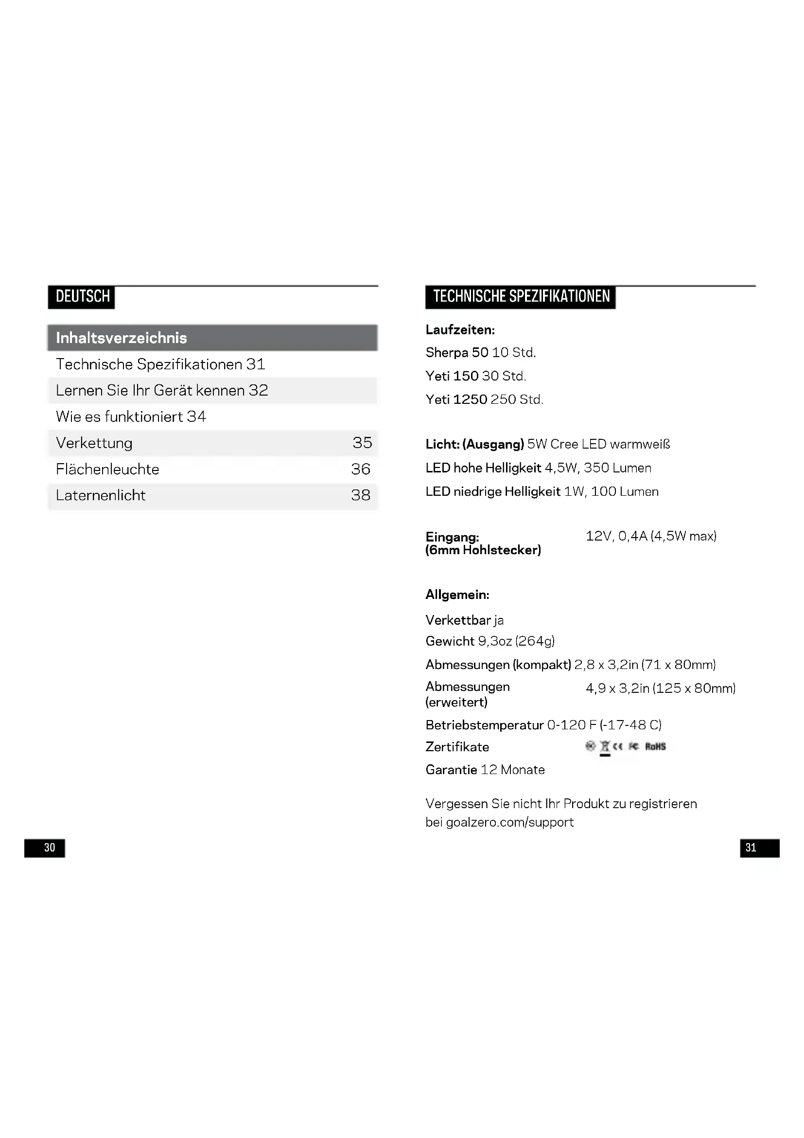 一方の手でライトの上部を掴ん で反時計回りに回します。シェ ードをずらして外します。3130 Laufzeiten: Sherpa 50 10 Std. Yeti 150 30 Std. Yeti 1250 250 Std. Licht: (Ausgang) 5W Cree LED warmweiß LED hohe Helligkeit 4,5W, 350 Lumen LED niedrige Helligkeit 1W, 100 Lumen Eingang: (6mm Hohlstecker) 12V, 0,4A (4,5W max) Allgemein: Verkettbar ja Gewicht 9,3oz (264g) Abmessungen (kompakt) 2,8 x 3,2in (71 x 80mm) Abmessungen (erweitert) 4,9 x 3,2in (125 x 80mm) Betriebstemperatur 0-120 F (-17-48 C) Zertifikate Garantie 12 Monate Vergessen Sie nicht Ihr Produkt zu registrieren bei goalzero.com/support TECHNISCHE SPEZIFIKATIONEN Inhaltsverzeichnis Technische Spezifikationen 31 Lernen Sie Ihr Gerät kennen 32 Wie es funktioniert 34 Verkettung 35 Flächenleuchte 36 Laternenlicht 38 DEUTSCH3332 6 mm 12 V Autoadapter Schirm Kerben Kabelhaken Netzschalter Hoch-aus-niedrig Einstellungen Magnet Verkettungsanschluss
