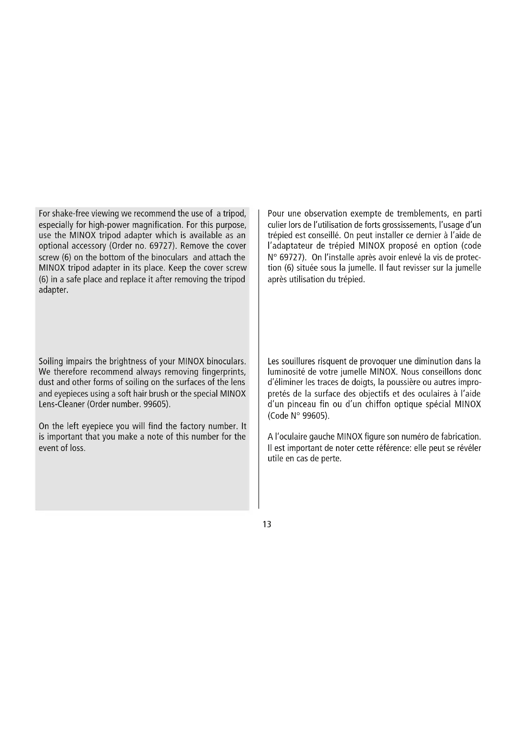 Verunreinigungen beeinträchtigen die Helligkeit Ihr's MINOX Fernglases. Deshalb empfehlen wir, Fingerabdrücke, Staub und andere Verunreinigungen der Objektiv- und Okularoberflächen mit einem weichen Haarpinsel oder dem speziellen MINOX Optik-Tuch (Best.-Nr. 99605) zu entfernen.