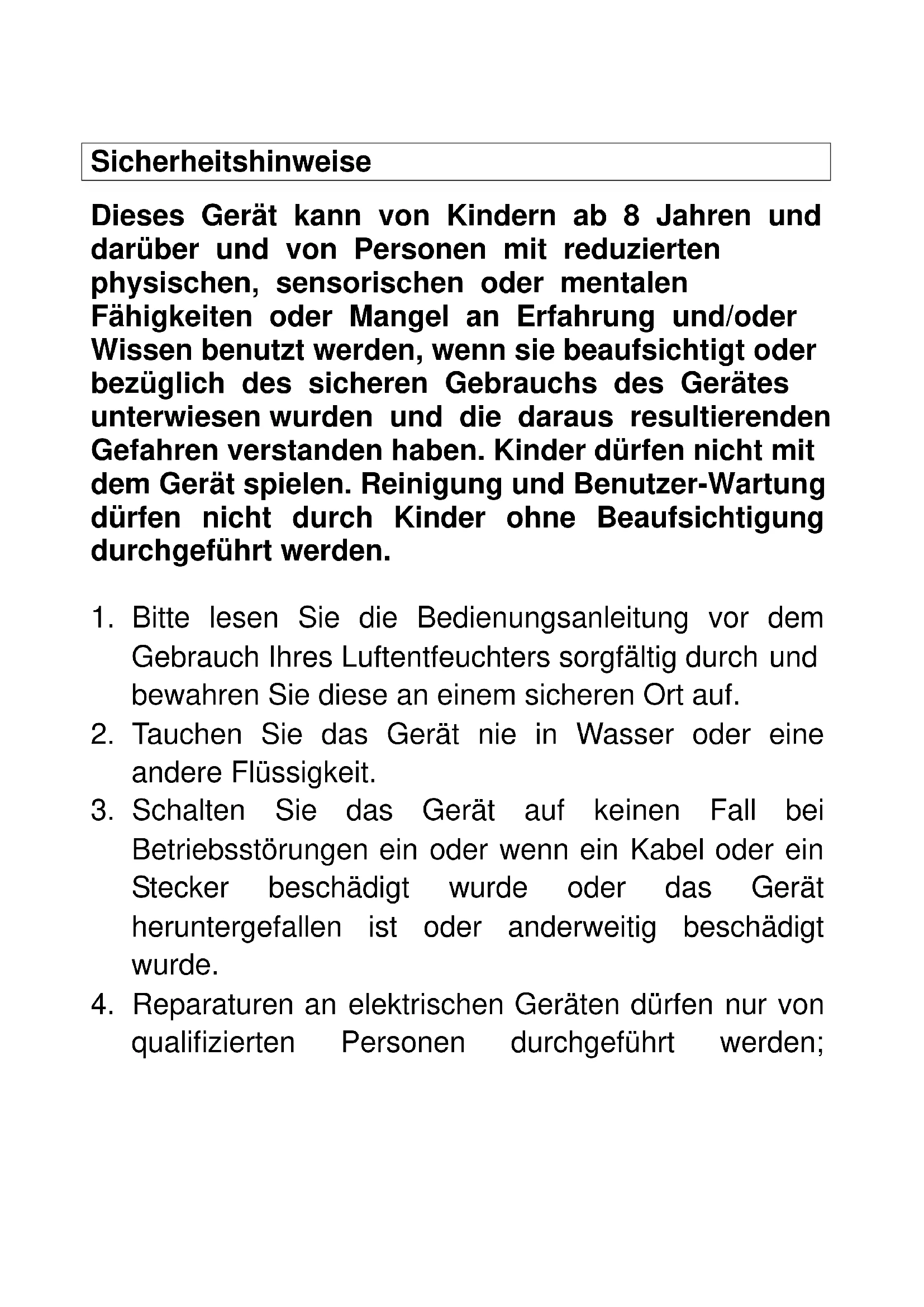 Bedienungsanleitung DESicherheitshinweise Dieses Gerät kann von Kindern ab 8 Jahren und darüber und von Personen mit reduzierten physischen, sensorischen oder mentalen Fähigkeiten oder Mangel an Erfahrung und/oder Wissen benutzt werden, wenn sie beaufsichtigt oder bezüglich des sicheren Gebrauchs des Gerätes unterwiesen wurden und die daraus resultierenden Gefahren verstanden haben. Kinder dürfen nicht mit dem Gerät spielen. Reinigung und Benutzer-Wartung dürfen nicht durch Kinder ohne Beaufsichtigung durchgeführt werden.
