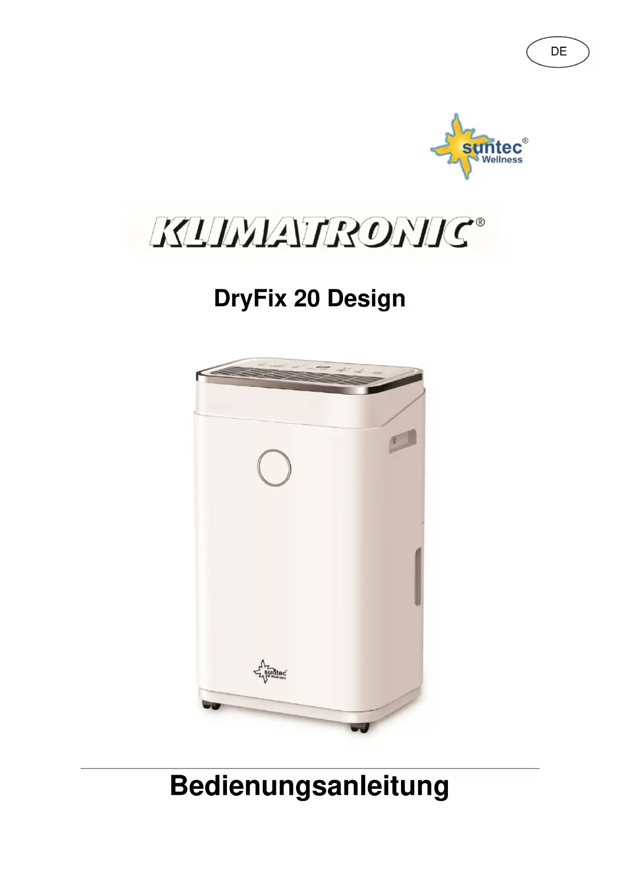 Bedienungsanleitung DEWir danken Ihnen für den Kauf dieses Geräts der Marke Suntec Wellness. Bitte lesen Sie die Bedienungsanleitung aufmerksam, bevor Sie das Gerät in Betrieb nehmen. Bewahren Sie diese Bedienungsanleitung zum späteren Nachschlagen auf. SICHERHEITSHINWEISE Dieses Gerät kann von Kindern ab 8 Jahren und darüber und von Personen mit reduzierten physischen, sensorischen oder mentalen Fähigkeiten oder Mangel an Erfahrung und/oder Wissen benutzt werden, wenn sie beaufsichtigt oder bezüglich des sicheren Gebrauchs des Gerätes unterwiesen wurden und die daraus resultierenden Gefahren verstanden haben. Kinder dürfen nicht mit dem Gerät spielen. Reinigung und Benutzer-Wartung dürfen nicht durch Kinder ohne Beaufsichtigung durchgeführt werden. Kinder unter 3 Jahren ohne permanente Aufsicht müssen daran gehindert werden, auf das Gerät zugreifen zu können. Kinder ab 3 Jahren und unter 8 Jahren dürfen das Gerät nur unter der Voraussetzung ein- und ausschalten, dass das Gerät in seiner vorgesehenen Gebrauchslage positioniert oder installiert, sie bezüglich des sicheren Gebrauchs des Gerätes unterwiesen und beaufsichtigt werden und die möglichen Gefahren verstanden haben. Kinder ab 3 Jahren und unter 8 Jahren dürfen das Gerät nicht an die Steckdose anschliessen, es regulieren, reinigen oder die Wartung durchführen.1. Bitte lesen Sie die Bedienungsanleitung vor dem Gebrauch Ihres Luftentfeuchters sorgfältig durch und bewahren Sie diese an einem sicheren Ort auf.