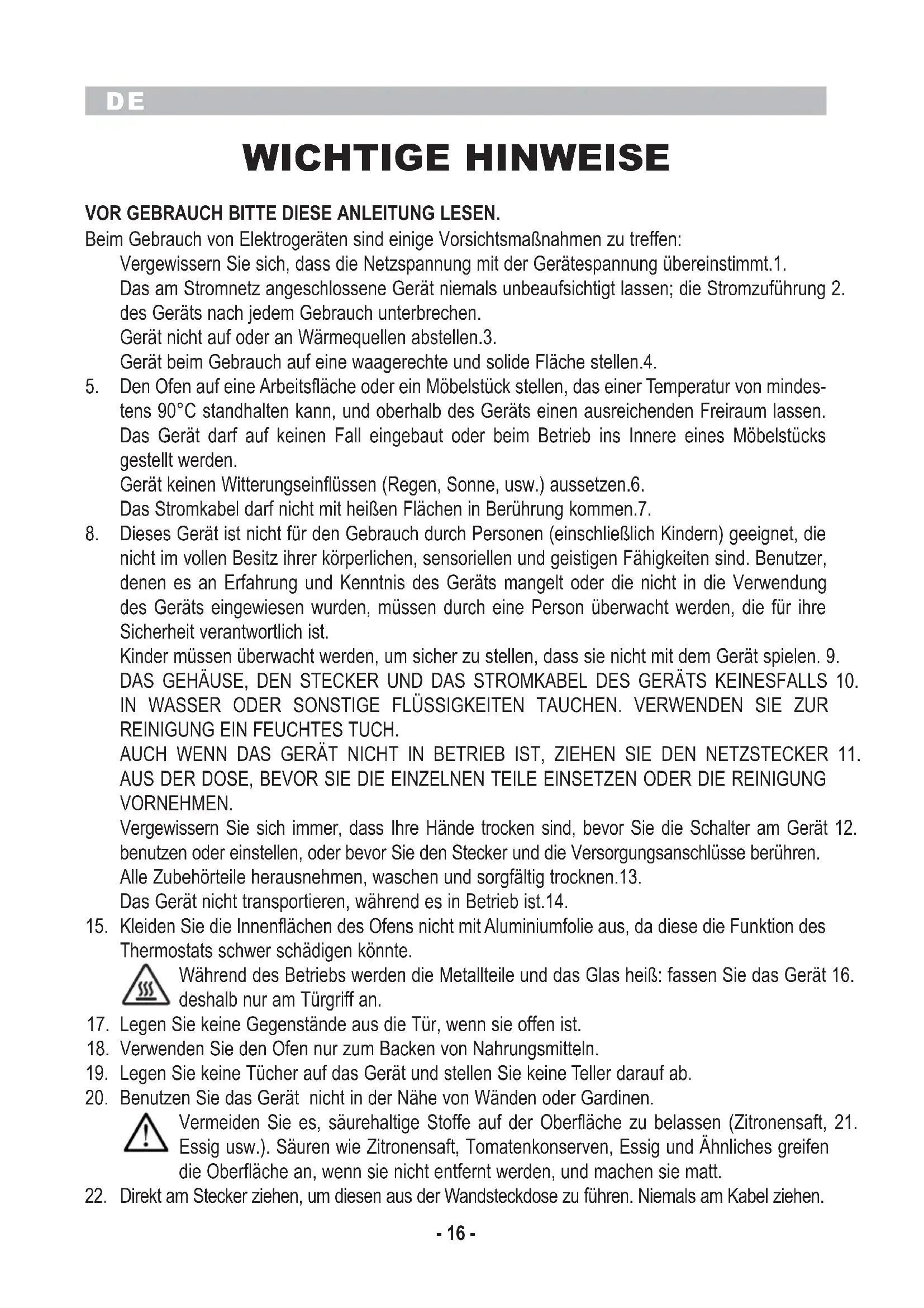 WICHTIGE HINWEISE VOR GEBRAUCH BITTE DIESE ANLEITUNG LESEN. Beim Gebrauch von Elektrogeräten sind einige Vorsichtsmaßnahmen zu treffen: Vergewissern Sie sich, dass die Netzspannung mit der Gerätespannung übereinstimmt.1. Das am Stromnetz angeschlossene Gerät niemals unbeaufsichtigt lassen; die Stromzuführung 2. des Geräts nach jedem Gebrauch unterbrechen. Gerät nicht auf oder an Wärmequellen abstellen.3. Gerät beim Gebrauch auf eine waagerechte und solide Fläche stellen.4. Den Ofen auf eine Arbeitsfläche oder ein Möbelstück stellen, das einer Temperatur von mindes-5. tens 90°C standhalten kann, und oberhalb des Geräts einen ausreichenden Freiraum lassen. Das Gerät darf auf keinen Fall eingebaut oder beim Betrieb ins Innere eines Möbelstücks gestellt werden. Gerät keinen Witterungseinflüssen (Regen, Sonne, usw.) aussetzen.6. Das Stromkabel darf nicht mit heißen Flächen in Berührung kommen.7. Dieses Gerät ist nicht für den Gebrauch durch Personen (einschließlich Kindern) geeignet, die 8. nicht im vollen Besitz ihrer körperlichen, sensoriellen und geistigen Fähigkeiten sind. Benutzer, denen es an Erfahrung und Kenntnis des Geräts mangelt oder die nicht in die Verwendung des Geräts eingewiesen wurden, müssen durch eine Person überwacht werden, die für ihre Sicherheit verantwortlich ist. Kinder müssen überwacht werden, um sicher zu stellen, dass sie nicht mit dem Gerät spielen. 9. DAS GEHÄUSE, DEN STECKER UND DAS STROMKABEL DES GERÄTS KEINESFALLS 10. IN WASSER ODER SONSTIGE FLÜSSIGKEITEN TAUCHEN. VERWENDEN SIE ZUR REINIGUNG EIN FEUCHTES TUCH. AUCH WENN DAS GERÄT NICHT IN BETRIEB IST, ZIEHEN SIE DEN NETZSTECKER 11. AUS DER DOSE, BEVOR SIE DIE EINZELNEN TEILE EINSETZEN ODER DIE REINIGUNG VORNEHMEN. Vergewissern Sie sich immer, dass Ihre Hände trocken sind, bevor Sie die Schalter am Gerät 12. benutzen oder einstellen, oder bevor Sie den Stecker und die Versorgungsanschlüsse berühren. Alle Zubehörteile herausnehmen, waschen und sorgfältig trocknen.13. Das Gerät nicht transportieren, während es in Betrieb ist.14. Kleiden Sie die Innenflächen des Ofens nicht mit Aluminiumfolie aus, da diese die Funktion des 15. Thermostats schwer schädigen könnte. Während des Betriebs werden die Metallteile und das Glas heiß: fassen Sie das Gerät 16. deshalb nur am Türgriff an. Legen Sie keine Gegenstände aus die Tür, wenn sie offen ist.17. Verwenden Sie den Ofen nur zum Backen von Nahrungsmitteln.18. Legen Sie keine Tücher auf das Gerät und stellen Sie keine Teller darauf ab.19. Benutzen Sie das Gerät nicht in der Nähe von Wänden oder Gardinen.20. Vermeiden Sie es, säurehaltige Stoffe auf der Oberfläche zu belassen (Zitronensaft, 21. Essig usw.). Säuren wie Zitronensaft, Tomatenkonserven, Essig und Ähnliches greifen die Oberfläche an, wenn sie nicht entfernt werden, und machen sie matt. Direkt am Stecker ziehen, um diesen aus der Wandsteckdose zu führen. Niemals am Kabel ziehen.22.DE