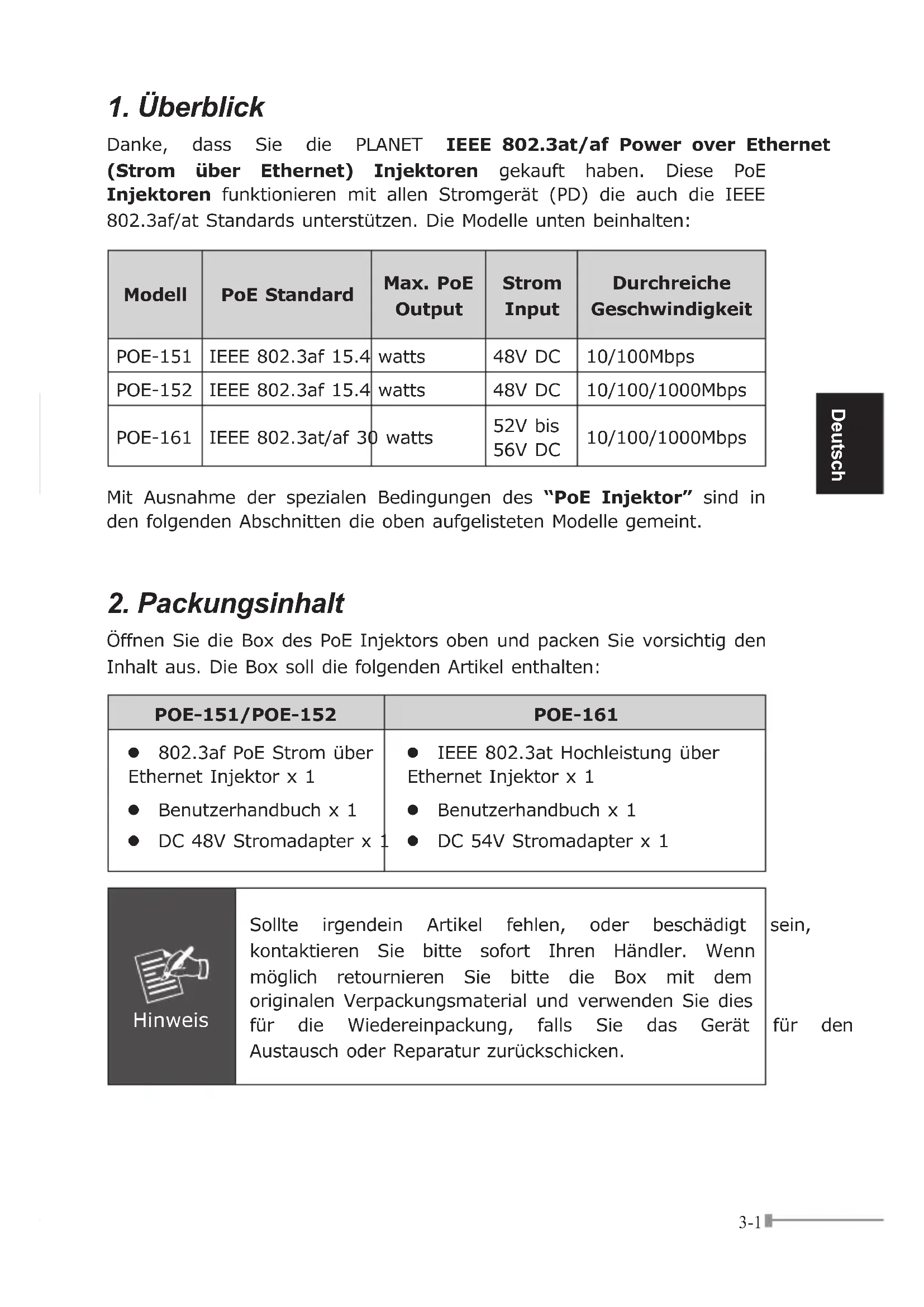 Danke, dass Sie die PLANET IEEE 802.3at/af Power over Ethernet (Strom über Ethernet) Injektoren gekauft haben. Diese PoE Injektoren Funktionieren mit allen Stromgerät (PD) die auch die IEEE 802.3af/at Standards unterstützt. Die Modelle unter beinhalten: