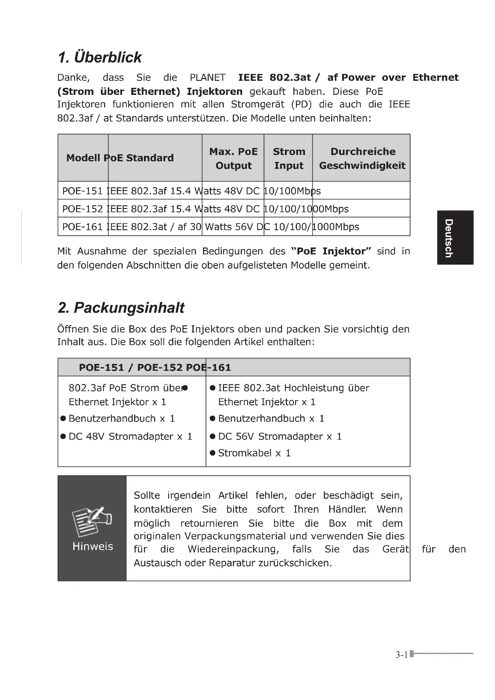 Danke, dass Sie die PLANET IEEE 802.3at / af Power over Ethernet (Strom über Ethernet) Injektoren gekauft haben. Diese PoE Injektoren Funktionieren mit allen Stromgerät (PD) die auch die IEEE 802.3af / at Standards unterstützen. Die Modelle unter beinhalten: