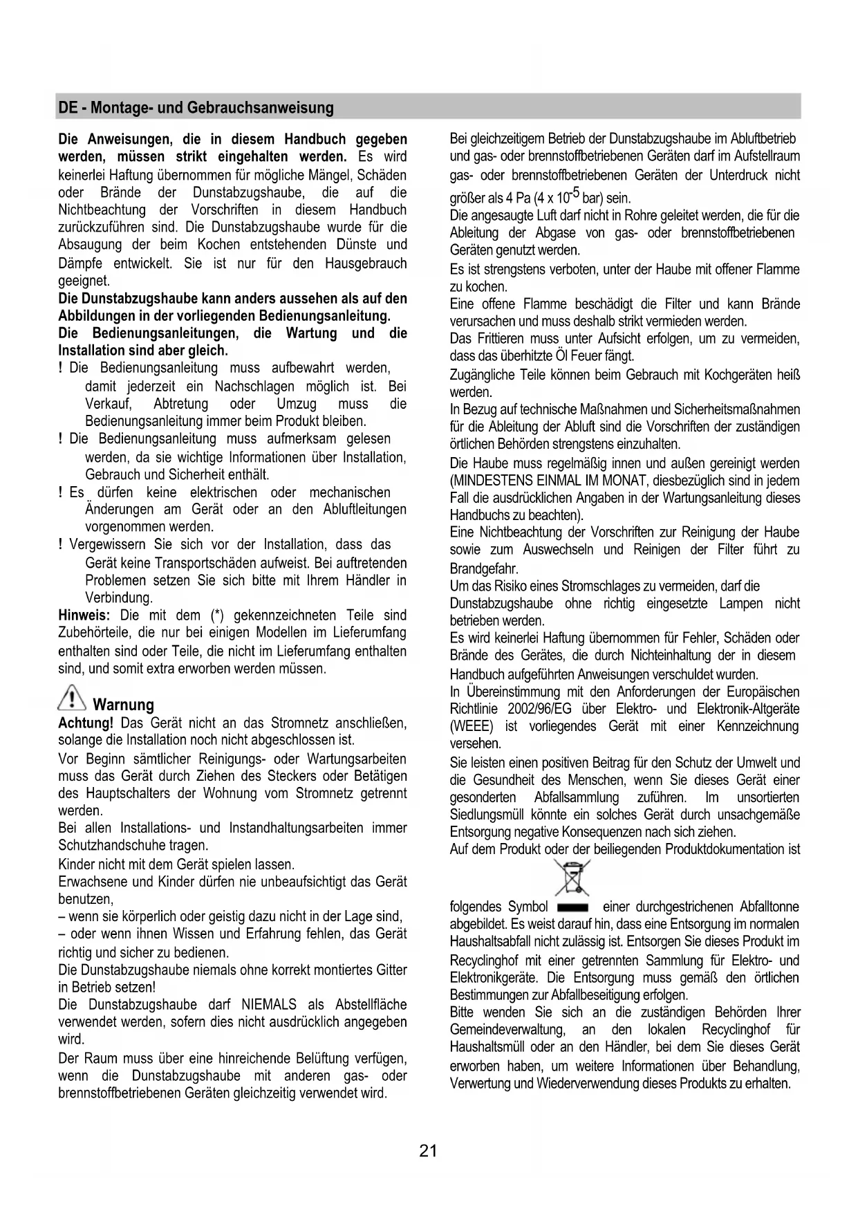 bar) sein. Die angesaugte Luft darf nicht in Rohre geleitet werden, die für die Ableitung der Abgase von gas- oder brennstoffbetriebenen Geräten genutzt werden. Es ist strengstens verboten, unter der Haube mit offener Flamme zu kochen. Eine offene Flamme beschädigt die Filter und kann Brände verursachen und muss deshalb strikt vermieden werden. Das Frittieren muss unter Aufsicht erfolgen, um zu vermeiden, dass das überhitzte Öl Feuer fängt. Zugängliche Teile können beim Gebrauch mit Kochgeräten heiß werden. In Bezug auf technische Maßnahmen und Sicherheitsmaßnahmen für die Ableitung der Abluft sind die Vorschriften der zuständigen örtlichen Behörden strengstens einzuhalten. Die Haube muss regelmäßig innen und außen gereinigt werden (MINDESTENS EINMAL IM MONAT, diesbezüglich sind in jedem Fall die ausdrücklichen Angaben in der Wartungsanleitung dieses Handbuchs zu beachten). Eine Nichtbeachtung der Vorschriften zur Reinigung der Haube sowie zum Auswechseln und Reinigen der Filter führt zu Brandgefahr. Um das Risiko eines Stromschlages zu vermeiden, darf die Dunstabzugshaube ohne richtig eingesetzte Lampen nicht betrieben werden. Es wird keinerlei Haftung übernommen für Fehler, Schäden oder Brände des Gerätes, die durch Nichteinhaltung der in diesem Handbuch aufgeführten Anweisungen verschuldet wurden. In Übereinstimmung mit den Anforderungen der Europäischen Richtlinie 2002/96/EG über Elektro- und Elektronik-Altgeräte (WEEE) ist vorliegendes Gerät mit einer Kennzeichnung versehen. Sie leisten einen positiven Beitrag für den Schutz der Umwelt und die Gesundheit des Menschen, wenn Sie dieses Gerät einer gesonderten Abfallsammlung zuführen. Im unsortierten Siedlungsmüll könnte ein solches Gerät durch unsachgemäße Entsorgung negative Konsequenzen nach sich ziehen. Auf dem Produkt oder der beiliegenden Produktdokumentation ist folgendes Symbol einer durchgestrichenen Abfalltonne abgebildet. Es weist darauf hin, dass eine Entsorgung im normalen Haushaltsabfall nicht zulässig ist. Entsorgen Sie dieses Produkt im Recyclinghof mit einer getrennten Sammlung für Elektro- und Elektronikgeräte. Die Entsorgung muss gemäß den örtlichen Bestimmungen zur Abfallbeseitigung erfolgen. Bitte wenden Sie sich an die zuständigen Behörden Ihrer Gemeindeverwaltung, an den lokalen Recyclinghof für Haushaltsmüll oder an den Händler, bei dem Sie dieses Gerät erworben haben, um weitere Informationen über Behandlung, Verwertung und Wiederverwendung dieses Produkts zu erhalten.22 WARNUNG! Erfolgt die Installation der Schrauben oder Befestigungsvorrichtungen nicht entsprechend den vorliegenden Anweisungen, führt dies zu Gefahr durch Stromschlag. Betriebsart Die Haube kann sowohl als Abluftgerät als auch als Umluftgerät eingesetzt werden. Abluftbetrieb Die Luft wird mit Hilfe eines Rohrs ins Freie geleitet, das am Abluftstutzen angebracht wird. Das Abluftrohr wird nicht mitgeliefert und muss separat erworben werden. Das Abluftrohr muss den gleichen Durchmesser wie der Abluftstutzen aufweisen. Das Abluftrohr auf den waagrechten Strecken leicht nach oben geführt werden (ca. 10%), damit die Luft ungehindert ins Freie abgeleitet werden kann. Hinweis: Sollte die Dunstabzugshaube mit Aktivkohlefilter versehen sein, so muss dieser entfernt werden. Die Dunstabzugshaube an Abluftrohre und Abluftöffnungen in der Wand anschließen, die den gleichen Durchmesser haben wie der Abluftstutzen (Anschlussflansch). Die Benutzung von Rohren und Abluftöffnungen mit geringerem Durchmesser verursacht eine Verringerung der Abluftleistung und eine drastische Zunahme der Geräuschentwicklung. Bei Nichtbeachtung der Anweisungen übernimmt der Hersteller keine Haftung. ! Ein möglichst kurzes Rohr verwenden. ! Ein Rohrsystem mit einer möglichst geringen Anzahl von Krümmungen verwenden (max. Winkel der Krümmung: 90°). ! Starke Änderungen des Rohrdurchmessers sind zu vermeiden. ! Die Innenfläche der Rohrs muss so glatt wie möglich sein. ! Verwenden Sie ausschließlich Rohre aus zugelassenen Materialien. Umluftbetrieb Es muss ein Aktivkohlefilter verwendet werden, der im Fachhandel erhältlich ist. Der Aktivkohlefilter reinigt die angesaugte Luft von Fettpartikeln und Kochdünsten, bevor diese durch das obere Gitter in die Küche zurückströmt. Modelle ohne Saugmotor funktionieren nur mit Abluftbetrieb und müssen an eine externe Saugeinheit (nicht im Lieferumfang enthalten) angeschlossen werden. Die Anschlussanleitungen liegen der externe Saugeinheit bei. Befestigung Der Abstand zwischen der Abstellfläche auf dem Kochfeld und der Unterseite der Dunstabzugshaube darf 50cm im Fall von elektrischen Kochfeldern und 65cm im Fall von Gas- oder kombinierten Herden nicht unterschreiten. Wenn die Installationsanweisungen des Gaskochgeräts einen größeren Abstand vorgeben, ist dieser zu berücksichtigen.