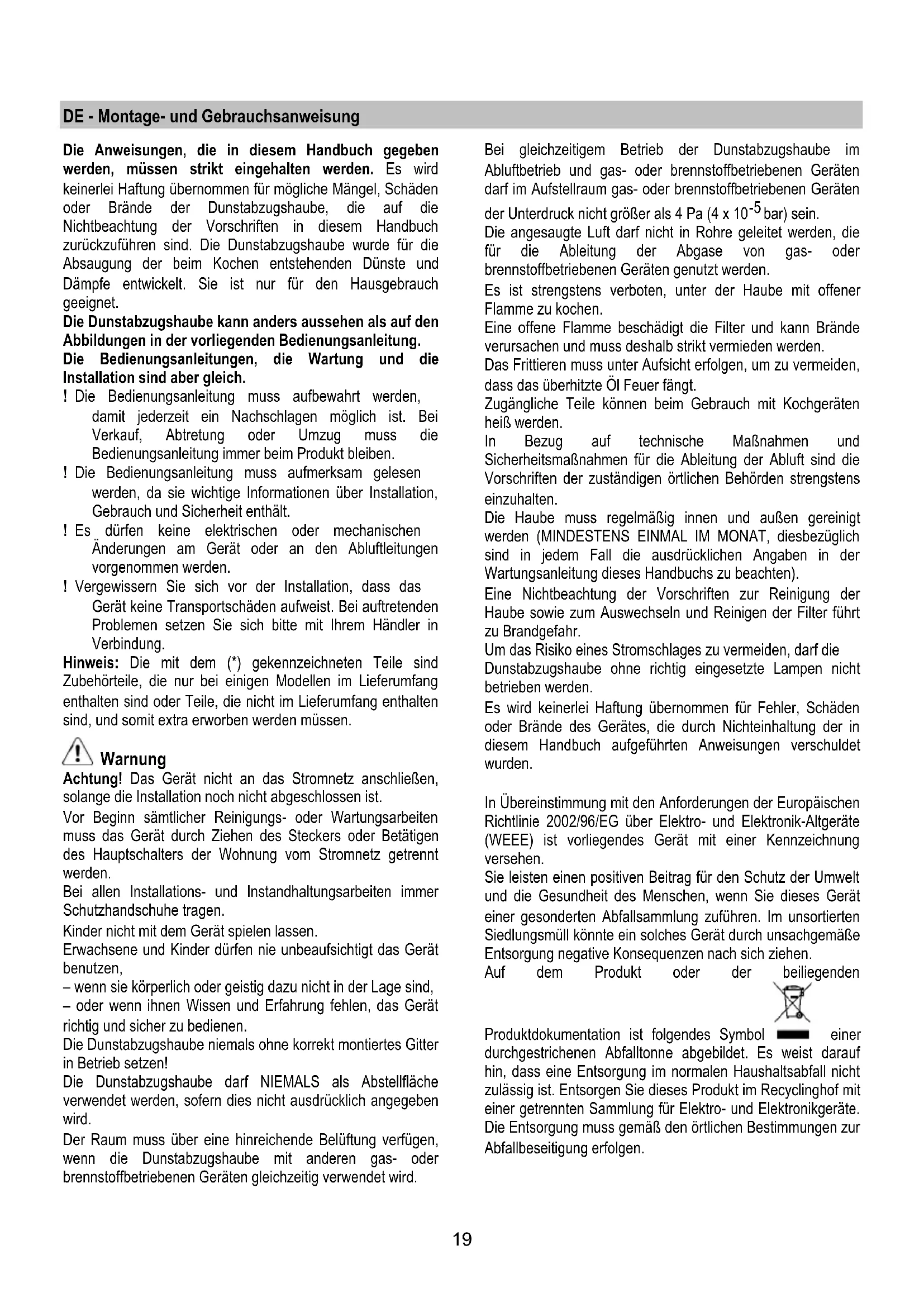 bar) sein. Die angesaugte Luft darf nicht in Rohre geleitet werden, die für die Ableitung der Abgase von gas- oder brennstoffbetriebenen Geräten genutzt werden. Es ist strengstens verboten, unter der Haube mit offener Flamme zu kochen. Eine offene Flamme beschädigt die Filter und kann Brände verursachen und muss deshalb strikt vermieden werden. Das Frittieren muss unter Aufsicht erfolgen, um zu vermeiden, dass das überhitzte Öl Feuer fängt. Zugängliche Teile können beim Gebrauch mit Kochgeräten heiß werden. In Bezug auf technische Maßnahmen und Sicherheitsmaßnahmen für die Ableitung der Abluft sind die Vorschriften der zuständigen örtlichen Behörden strengstens einzuhalten. Die Haube muss regelmäßig innen und außen gereinigt werden (MINDESTENS EINMAL IM MONAT, diesbezüglich sind in jedem Fall die ausdrücklichen Angaben in der Wartungsanleitung dieses Handbuchs zu beachten). Eine Nichtbeachtung der Vorschriften zur Reinigung der Haube sowie zum Auswechseln und Reinigen der Filter führt zu Brandgefahr. Um das Risiko eines Stromschlages zu vermeiden, darf die Dunstabzugshaube ohne richtig eingesetzte Lampen nicht betrieben werden. Es wird keinerlei Haftung übernommen für Fehler, Schäden oder Brände des Gerätes, die durch Nichteinhaltung der in diesem Handbuch aufgeführten Anweisungen verschuldet wurden. In Übereinstimmung mit den Anforderungen der Europäischen Richtlinie 2002/96/EG über Elektro- und Elektronik-Altgeräte (WEEE) ist vorliegendes Gerät mit einer Kennzeichnung versehen. Sie leisten einen positiven Beitrag für den Schutz der Umwelt und die Gesundheit des Menschen, wenn Sie dieses Gerät einer gesonderten Abfallsammlung zuführen. Im unsortierten Siedlungsmüll könnte ein solches Gerät durch unsachgemäße Entsorgung negative Konsequenzen nach sich ziehen. Auf dem Produkt oder der beiliegenden Produktdokumentation ist folgendes Symbol einer durchgestrichenen Abfalltonne abgebildet. Es weist darauf hin, dass eine Entsorgung im normalen Haushaltsabfall nicht zulässig ist. Entsorgen Sie dieses Produkt im Recyclinghof mit einer getrennten Sammlung für Elektro- und Elektronikgeräte. Die Entsorgung muss gemäß den örtlichen Bestimmungen zur Abfallbeseitigung erfolgen.20 Bitte wenden Sie sich an die zuständigen Behörden Ihrer Gemeindeverwaltung, an den lokalen Recyclinghof für Haushaltsmüll oder an den Händler, bei dem Sie dieses Gerät erworben haben, um weitere Informationen über Behandlung, Verwertung und Wiederverwendung dieses Produkts zu erhalten. WARNUNG! Erfolgt die Installation der Schrauben oder Befestigungsvorrichtungen nicht entsprechend den vorliegenden Anweisungen, führt dies zu Gefahr durch Stromschlag. Betriebsart Die Haube kann sowohl als Abluftgerät als auch als Umluftgerät eingesetzt werden. Abluftbetrieb Die Luft wird mit Hilfe eines Rohrs ins Freie geleitet, das am Abluftstutzen angebracht wird. Das Abluftrohr wird nicht mitgeliefert und muss separat erworben werden. Das Abluftrohr muss den gleichen Durchmesser wie der Abluftstutzen aufweisen. Das Abluftrohr auf den waagrechten Strecken leicht nach oben geführt werden (ca. 10%), damit die Luft ungehindert ins Freie abgeleitet werden kann. Hinweis: Sollte die Dunstabzugshaube mit Aktivkohlefilter versehen sein, so muss dieser entfernt werden. Die Dunstabzugshaube an Abluftrohre und Abluftöffnungen in der Wand anschließen, die den gleichen Durchmesser haben wie der Abluftstutzen (Anschlussflansch). Die Benutzung von Rohren und Abluftöffnungen mit geringerem Durchmesser verursacht eine Verringerung der Abluftleistung und eine drastische Zunahme der Geräuschentwicklung. Bei Nichtbeachtung der Anweisungen übernimmt der Hersteller keine Haftung. ! Ein möglichst kurzes Rohr verwenden. ! Ein Rohrsystem mit einer möglichst geringen Anzahl von Krümmungen verwenden (max. Winkel der Krümmung: 90°). ! Starke Änderungen des Rohrdurchmessers sind zu vermeiden. ! Die Innenfläche der Rohrs muss so glatt wie möglich sein. ! Verwenden Sie ausschließlich Rohre aus zugelassenen Materialien. Umluftbetrieb Es muss ein Aktivkohlefilter verwendet werden, der im Fachhandel erhältlich ist. Der Aktivkohlefilter reinigt die angesaugte Luft von Fettpartikeln und Kochdünsten, bevor diese durch das obere Gitter in die Küche zurückströmt. Modelle ohne Saugmotor funktionieren nur mit Abluftbetrieb und müssen an eine externe Saugeinheit (nicht im Lieferumfang enthalten) angeschlossen werden. Die Anschlussanleitungen liegen der externe Saugeinheit bei. Befestigung Der Abstand zwischen der Abstellfläche auf dem Kochfeld und der Unterseite der Dunstabzugshaube darf 50cm im Fall von elektrischen Kochfeldern und 65cm im Fall von Gas- oder kombinierten Herden nicht unterschreiten. Wenn die Installationsanweisungen des Gaskochgeräts einen größeren Abstand vorgeben, ist dieser zu berücksichtigen.