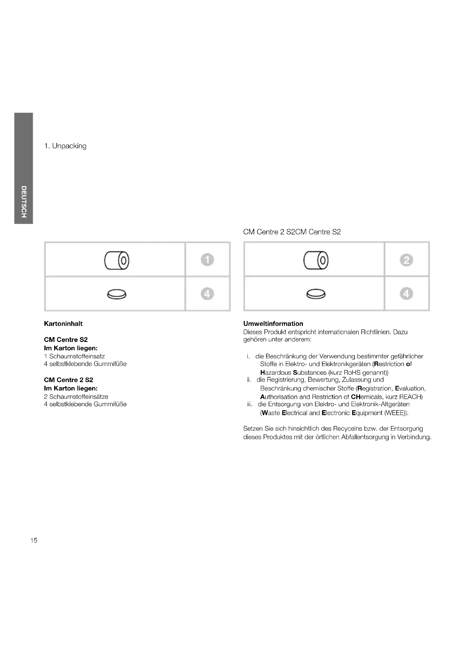 Kartoninhalt CM Centre S2 Im Karton liegen: 1 Schaumstoffeinsatz 4 selbstklebende Gummifüße CM Centre 2 S2 Im Karton liegen: 2 Schaumstoffeinsätze 4 selbstklebende Gummifüße Umweltinformation Dieses Produkt entspricht internationalen Richtlinien. Dazu gehören unter anderem: