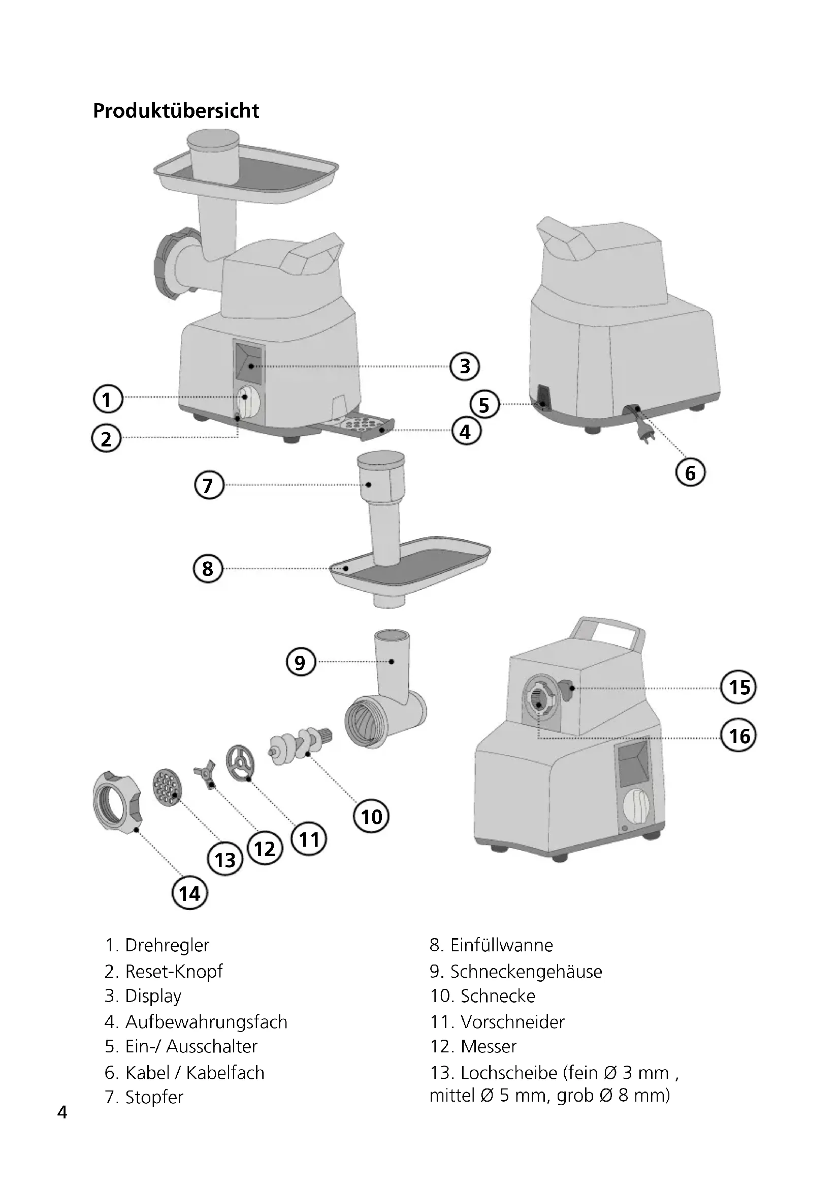 Lassen Sie alle Teile nach der Reinigung vollständig trocknen. Setzen Sie den Fleischwolf-Auafsatz wieder zusammen. Die nichtverwendeten Lochscheiben konnen Sie in dem Aufbewährungsfach verstauen.