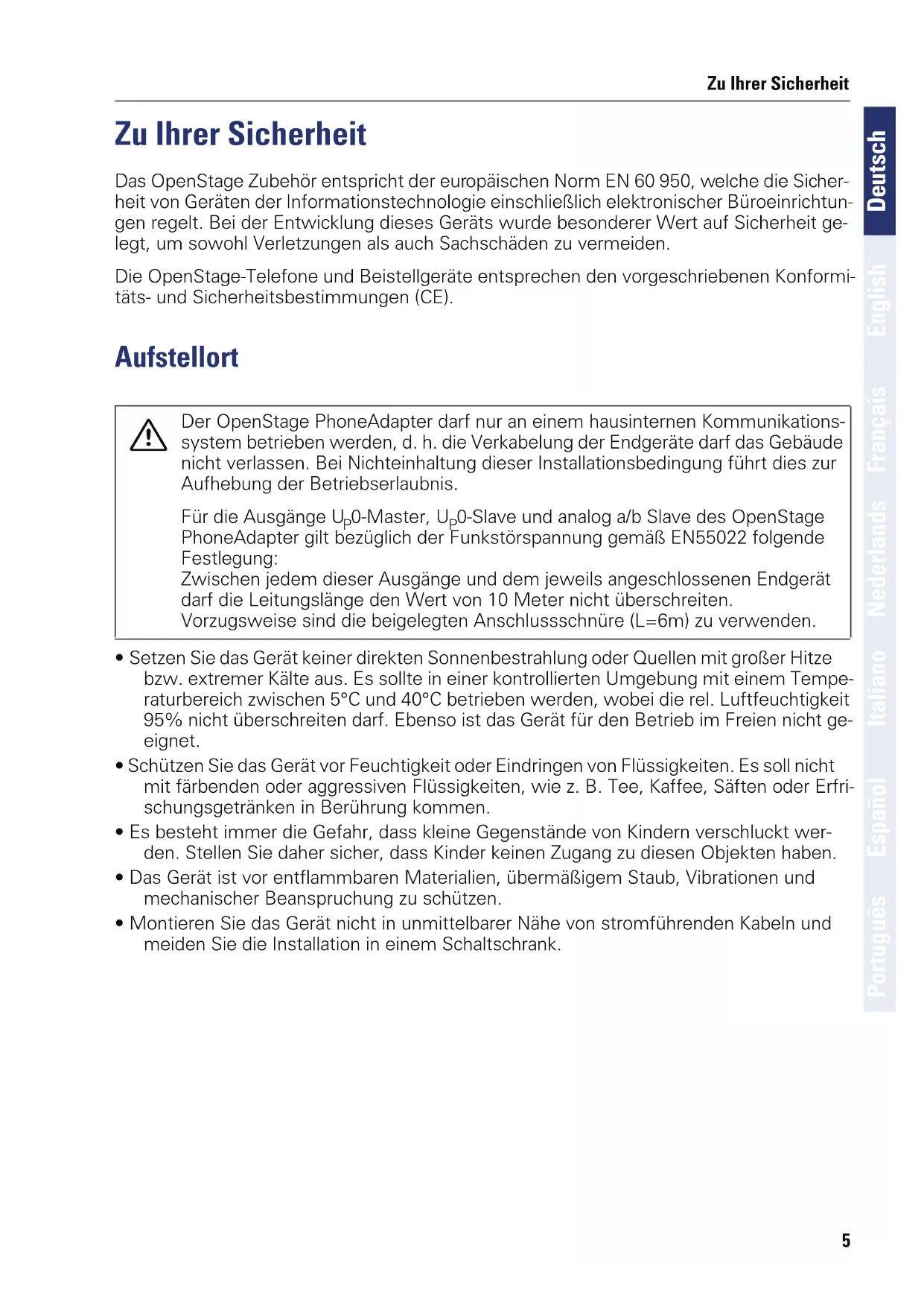 Das OpenStage Zubehör entspricht der europäischen Norm EN 60 950, welche die Sicherheit von Geräten der Informationstechnologie einschließlich elektronischer Böroeinrichtungen regelt. Bei der Entwicklung dieser Gesamtswerte wurde besonderer Wert auf Sicherheit gelegt, um sowohl Verletzungen als auch Sachschaenen zu vermeiden.