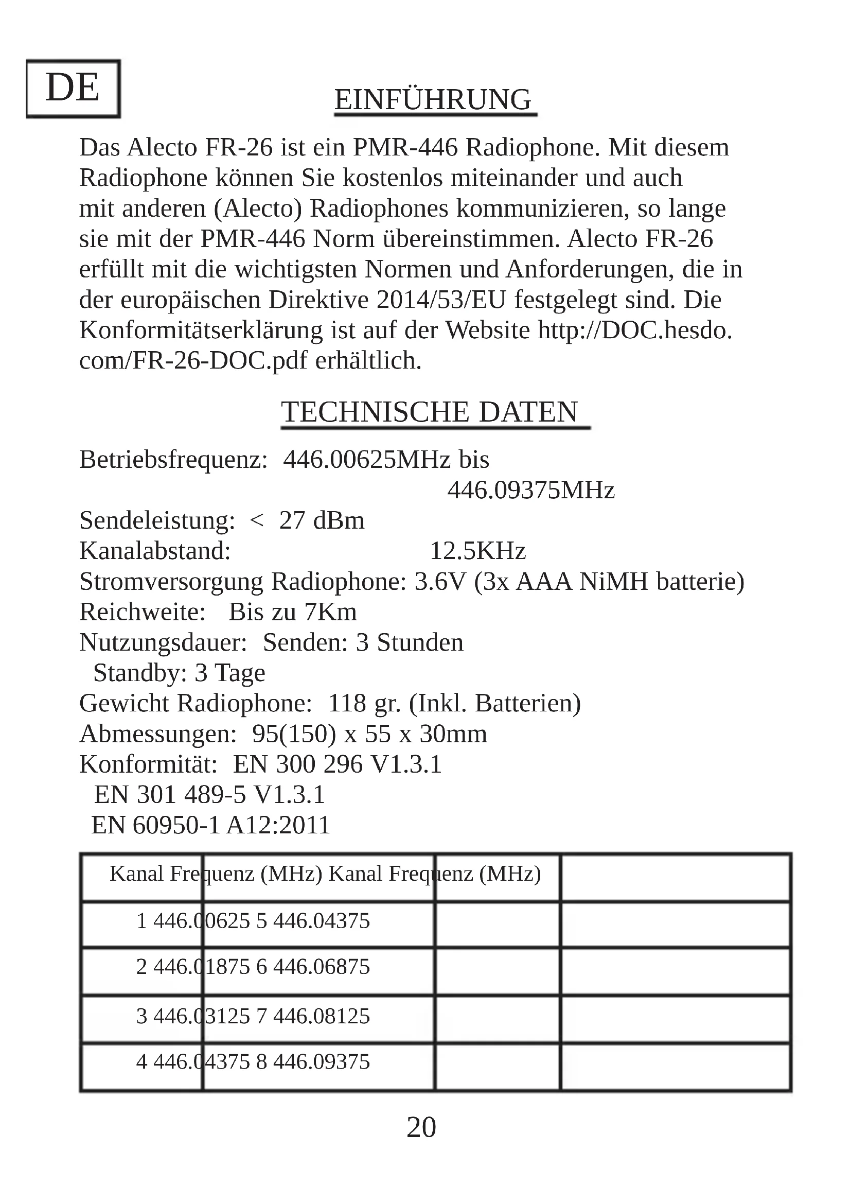 STROMSPARMODUS: Das FR-26 ist mit einem automatischen Stromsparmodus ausgestattet, um die Lebensdauer der Akkus zu verlängern. Wenn das Gerät für 4 Sekunden nicht genutzt wird, wechselt es automatisch in den Stromsparmodus. Sobald Sie das PMR wieder in Betrieb nehmen oder es ein Signal empfängt, schaltet das PMR wieder zurück auf normalen Betrieb. AKKUKAPAZITÄTSWÄCHTER: Wenn das FR-26 eine geringe Akkukapazität erkennt, wird dies auf dem Display durch ein Symbol angezeigt. Das PMR gibt zwei Pieptöne aus und schaltet dann automatisch ab, während das Symbol anfängt zu blinken. Bitte laden Sie die Akkus auf, indem Sie das Radiiophone auf die Ladestation stellen. Laden Sie die Akkus 10 bis 14 Stunden auf.26 27 ANWENDERTIPPS ALLGEMEIN: Das FR-26 ist ein Sender/Empfänger, der mit Radiowellen auf dem 446 MHz Band funktioniert. Die Signalübertragung kann von äußeren Einflüssen, wie z.B. anderen Radiophones, Sendern, schnurlosen Telefonen, etc. beeinträchtigt werden. Wenn Ihr Radiophone gestört wird oder Interferenzen verursacht, wird dieses Problem normalerweise durch Wechseln des Kanals gelöst. Die Verwendung dieses Radiophones ist in allen EU-Ländern zulässig. Wenn Sie das FR-26 in Länder außerhalb der EU mitnehmen möchten, sollten Sie die lokalen Beschränkungen für die Verwendung von PMR446- Geräten beachten. Denken Sie daran, dass das Signal von FR-26 auch von anderen Radiophones oder Empfängern gehört werden kann. Änderungen an der Elektronik oder der Antenne des FR-26 sind in keinster Weise zulässig. Service darf nur von qualifizierem Servicepersonal durchgeführt werden. Verwenden Sie das FR-26 niemals bei Gewittern im Freien.28 WARTUNG: - Reinigen Sie das FR-26 nur mit einem feuchten Tuch. - Setzen Sie das Radiophone niemals direkter Sonneneinstrahlung oder feuchten Umgebungen aus. - Lassen Sie kein Wasser und/oder Sand in das FR-26 eindringen. - Falls Probleme auftreten, überprüfen Sie zunächst, ob FR-26 an einem anderen Standort richtig funktioniert. RADIOANSCHLUSS: Das FR-26 hat eine effektive Reichweite bis zu 7 km. Diese Reichweite kann von lokalen Bedingungen, wie z.B. hohe Gebäude, Hochspannungsleitungen und Freileitungen beeinträchtigt werden. Eine optimale Reichweite wird erzielt, wenn das Radiophone klare Sicht zum Empfänger hat. UMWELT: Wenn Sie Ihr Radiophone entsorgen müssen, bringen Sie es zurück zu Ihrem Händler. Er kann eine umweltfreundliche Entsorgung gewährleisten.28 29 GARANTIEKARTE Für diesen ALECTO FR-26 besteht eine Garantie von 24 Monaten ab Kaufdatum. Während dieses Zeitraums garantieren wir, dass alle Defekte, die durch Material- oder Konstruktionsfehler verursacht werden, kostenlos repariert werden. Der Importeur betimmt diese Bedingungen. VORGEHENSWEISE: Wenn Sie Anomalien bemerken, lesen Sie zunächst die Bedienungsanleitung. Wenn Sie keine Lösung für Ihr Problem finden, wenden Sie sich an Ihren Händler oder unseren Kundendienst: www.alecto.nl. GARANTIEDECKUNG ENDET : Bei Fehlanwendung, falschem Anschluss, auslaufendem Akku oder falscher Positionierung der Akkus. Verwendung von Teilen oder Zubehör, die nicht zum Lieferumgang des Geräts gehören, Fehler aufgrund von Feuchtigkeit, Feuer, Überflutung, Blitzschlag oder sonstige Naturkatastrophen sind von der Garantie nicht abgedeckt. Änderungen oder Modifizierungen des Produkts durch unautorisiertes qualifiziertes Servicepersonal sind von der Garantie nicht abgedeckt. Die Garantie endet bei falschem Transport des Geräts ohne geeignete Verpackung oder wenn dem Gerät keine Garantiekarte und kein Kaufbeleg beigelegt ist. Kabel, Buchsen und Akkus sind von der Garantie nicht abgedeckt. Alecto kann für indirekte, Folge- oder Sonderschäden nicht haftbar gemacht werden.30 INTRODUCTION The Alecto FR-26 is a PMR-446 Radiophone. This radiophone allows for free-of-charge communication back and forth, as well as communication with other (Alecto) radiophones as long as these meet the PMR-446 standard. The Alecto FR-26 complies with the essential requirements and provisions as described in the European Directive 2014/53/EU. The declaration of conformity is available on the website http://DOC.hesdo.com/FR-26-DOC.pdf TECHNICAL SPECIFICATIONS Operating frequency: 446.00625MHz to 446.09375MHz Transmitting power: < 27 dBm Channel separation: 12.5KHz Power supply radiophone: 3.6V (3x AAA NiMH battery) Range: up to 7Km Period of use: transmitting: 3 hours stand-by: 3 days Weight radiophone: 118 gr. (incl. batteries) Dimensions: 95(150) x 55 x 30mm Conform: EN 300 296 V1.3.1 EN 301 489-5 V1.3. EN 60950-1 A12:2011 Channel Frequency (MHz) Channel Frequency (MHz)