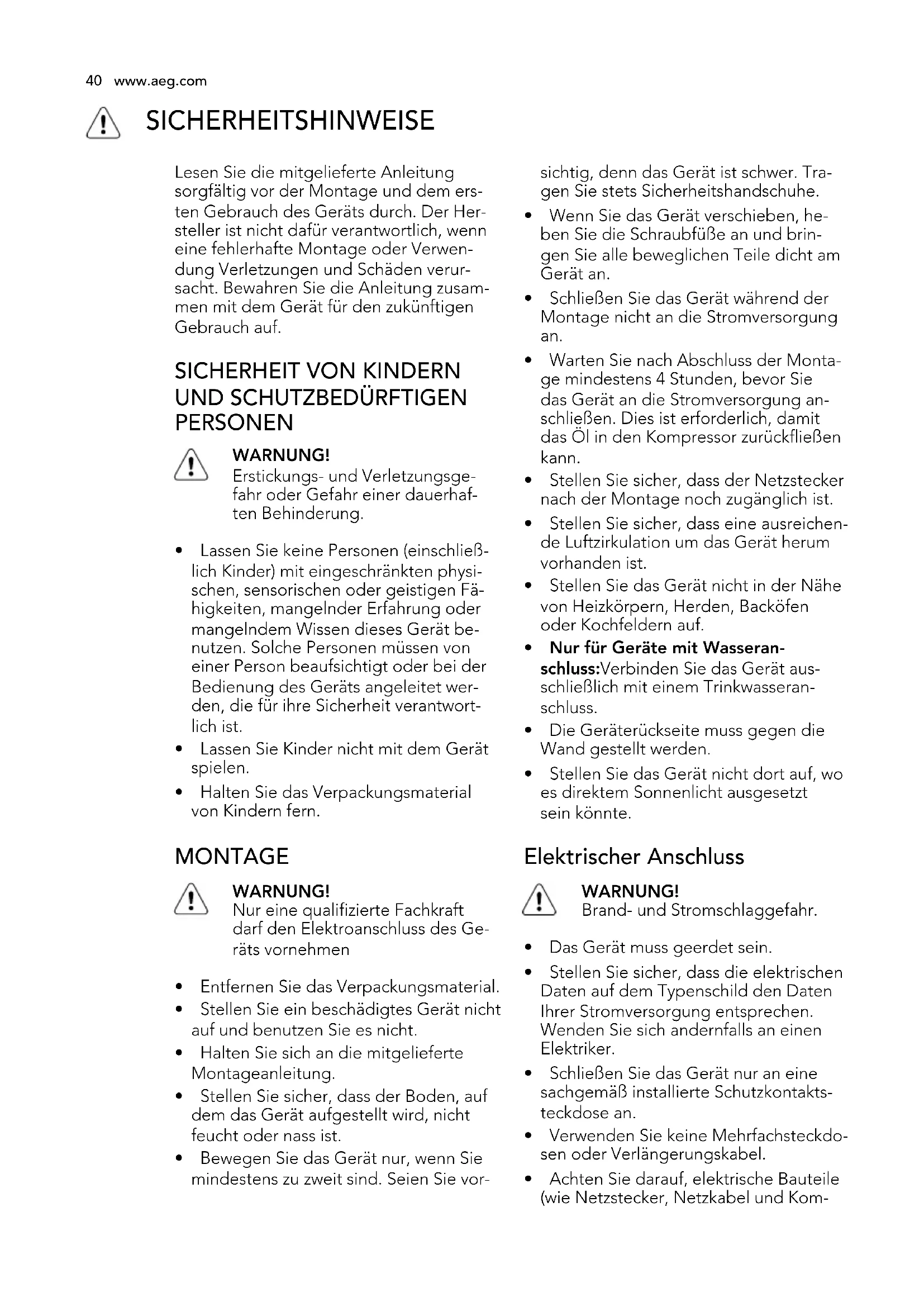 Bitte verwenden Sie ausschließlich Original-Ersatzteile für Ihre Produkte. Halten Sie folgende Angaben bereit, wenn Sie sich an den Kundendienst wenden (diese Informationen nden Sie auf dem Typenschild): Modell, Produktnummer (PNC), Seriennummer. Warnung - Wichtige Sicherheitshinweise. Allgemeine Hinweise und Ratschläge Hinweise zum Umweltschutz Änderungen vorbehalten.40 www.aeg.com SICHERHEITSHINWEISE Lesen Sie die mitgelieferte Anleitung sorgfältig vor der Montage und dem ers- ten Gebrauch des Geräts durch. Der Her- steller ist nicht dafür verantwortlich, wenn eine fehlerhafte Montage oder Verwen- dung Verletzungen und Schäden verur- sacht. Bewahren Sie die Anleitung zusam- men mit dem Gerät für den zukünftigen Gebrauch auf.