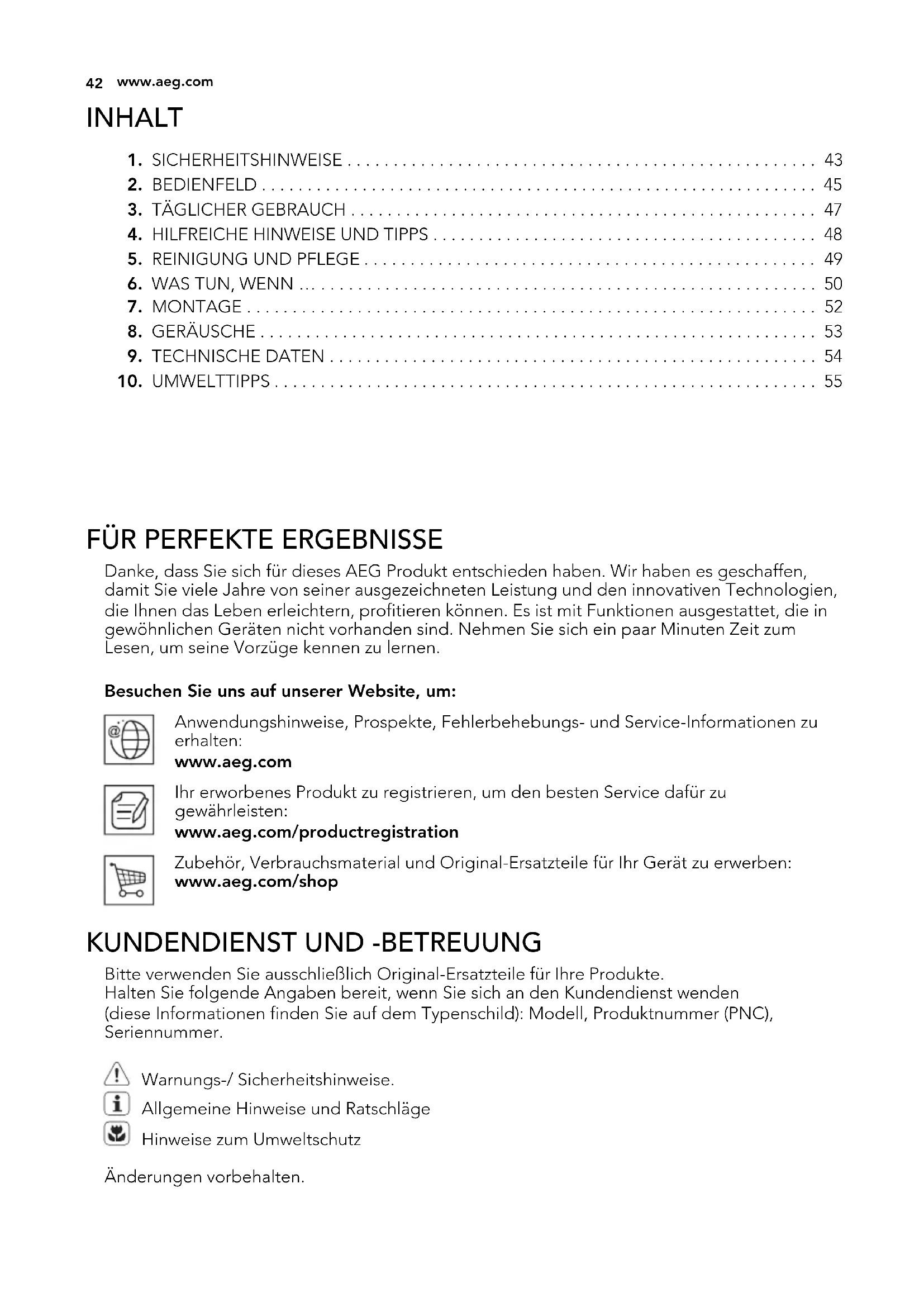Danke, dass Sie sich für dieses AEG Produkt entschieden haben. Wir haben es geschaffen, damit Sie viele Jahre von seiner ausgezeichneten Leistung und den innovativen Technologien, die Ihnen das Leben erleichtern, profitieren können. Es ist mit Funktionen ausgestattet, die in gewöhnlichen Geräten nicht vorhanden sind. Nehmen Sie sich ein paar Minuten Zeit zum Lesen, um seine Vorzüge kennen zu lernen. Besuchen Sie uns auf unserer Website, um: Anwendungshinweise, Prospekte, Fehlerbehebungs- und Service-Informationen zu erhalten: www.aeg.com Ihr erworbenes Produkt zu registrieren, um den besten Service dafür zu gewährleisten: www.aeg.com/productregistration Zubehör, Verbrauchsmaterial und Original-Ersatzteile für Ihr Gerät zu erwerben: www.aeg.com/shop