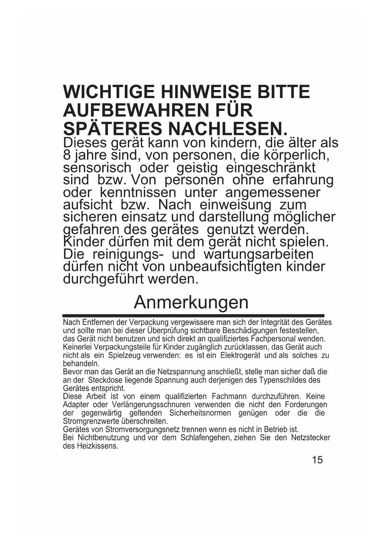SPÄTERES NACHLESEN. Dieses gerät kann von kindern, die älter als 8 jahre sind, von personen, die körperlich, sensorisch oder geistig eingeschränkt sind bzw. Von personen ohne erfahrung oder kenntnissen unter angemessener aufsicht bzw. Nach einweisung zum sicheren einsatz und darstellung möglicher gefahren des gerätes genutzt werden. Kinder dürfen mit dem gerät nicht spielen. Die reinigungs- und wartungsarbeiten dürfen nicht von unbeaufsichtigten kinder durchgeführt werden. Anmerkungen Nach Entfernen der Verpackung vergewissere man sich der Integrität des Gerätes und sollte man bei dieser Überprüfung sichtbare Beschädigungen festestellen, das Gerät nicht benutzen und sich direkt an qualiziertes Fachpersonal wenden. Keinerlei Verpackungsteile für Kinder zugänglich zurücklassen, das Gerät auch nicht als ein Spielzeug verwenden: es ist ein Elektrogerät und als solches zu behandeln. Bevor man das Gerät an die Netzspannung anschließt, stelle man sicher daß die an der Steckdose liegende Spannung auch derjenigen des Typenschildes des Gerätes entspricht. Diese Arbeit ist von einem qualizierten Fachmann durchzuführen. Keine Adapter oder Verlängerungsschnuren verwenden die nicht den Forderungen der gegenwärtig geltenden Sicherheitsnormen genügen oder die die Stromgrenzwerte überschreiten. Gerätes von Stromversorgungsnetz trennen wenn es nicht in Betrieb ist. Bei Nichtbenutzung und vor dem Schlafengehen, ziehen Sie den Netzstecker des Heizkissens.21 Der Gebrauch irgendeines Elektrogerätes erfordert immer die Beachtung einiger grundlegenden Regeln und zwar insbesondere: - Man darf niemals das Gerät mit nassen oder feuchten Händen berühren. - Das Gerät nicht den Witterungseinüssen ausgesetzt lassen (Regen, Sonnenstrahlung). - Gerät nicht Schlag-oder Stoßbeanspruchungen aussetzen. Um eventuelle Überhitzungen zu vermeiden, es ist empfehlen, das Netzkabel für seine ganze Länge abzuwickeln. Bei Vorliegen eines Defektes, einer Auslösung der Sicherung oder der Schmelzschutzsicherung, bzw. einer ungewöhnlichen Funktionsweise des Gerätes muss unverzüglich der Stecker gezogen werden, dürfen keine Veränderungen am Gerät vorgenommen werden und muss eine zugelassene Kundendienststelle verständigt werden. Bei Erscheinen einer Störung beziehungsweise einem nicht einwandfrein Betrieb des Gerätes ziehen Sie sofort den Stecker, nehmen Sie Keinerlei Eingriff am Gerät vor, und wenden Sie sich an eine zugelassene Servicewerkstatt. Sollten Sie sich dafür entscheiden diesen Gerät nicht mehr zu benutzen,so sind Sie angebrancht, das Gerät durch Abschneiden des Netzkabels unbenutzbar zu machen,natürlich nach dessen Abtrennung von der Steckdose. Das Gerät wurde für den Betrieb in Wohnbereichen als Heizkissen gebaut und konzipiert; deshalb ist jeder andersartige Gebrauch als unsachgemäß und daher gefährlich zu betrachten. Bei Vorliegen eines Defektes, einer Auslösung der Sicherung oder der Schmelzschutzsicherung, bzw. einer ungewöhnlichen Funktionsweise des Gerätes muss unverzüglich der Stecker gezogen werden, dürfen keine Veränderungen am Gerät vorgenommen werden und muss eine zugelassene Kundendienststelle verständigt werden. Das Gerät darf nur mit dem Steuerungstyp verwendet werden, der auf dem Gerät gekennzeichnet ist. Aus Sicherheitsgründen dürfen das Gerät und die Steuerung nicht geöffnet werden. Die Steuerung keinen Wärmequellen nähern. Die Steuerung nicht abdecken oder sie auf das Gerät setzen, während es in Betrieb steht. Das Gerät darf nicht vom Gewicht des Körpers belastet werden, sondern ist stets auf die schmerzende Region zu setzen. Das Gerät nicht im Freien benutzen. Das Gerät nicht benutzen, wenn es feucht oder nass ist. Kinder dürfen nicht mit dem Gerät spielen. Kinder unter 3 Jahren dürfen dieses Gerät nicht benutzen, da sie nicht in der Lage sind, auf Überhitzungen zu reagieren. Das Gerät darf nicht von Kindern benutzt werden, es sei denn, ein Elternteil oder eine überwachende Person haben die Steuerungen voreingestellt oder das Kind wurde angemessen auf den sicheren Betrieb der Steuerung eingewiesen. Eine verlängerte Anwendung mit hoher Einstellung kann auf der Haut Verbrennungen verursachen.17 Die Steuereinheit keinen Hitzequellen nähern. Die Steuereinheit nicht abdecken oder sie auf das in Betrieb stehende Gerät positionieren. Das Heizkissen ist nicht für die Benutzung im Krankenhaus bestimmt.