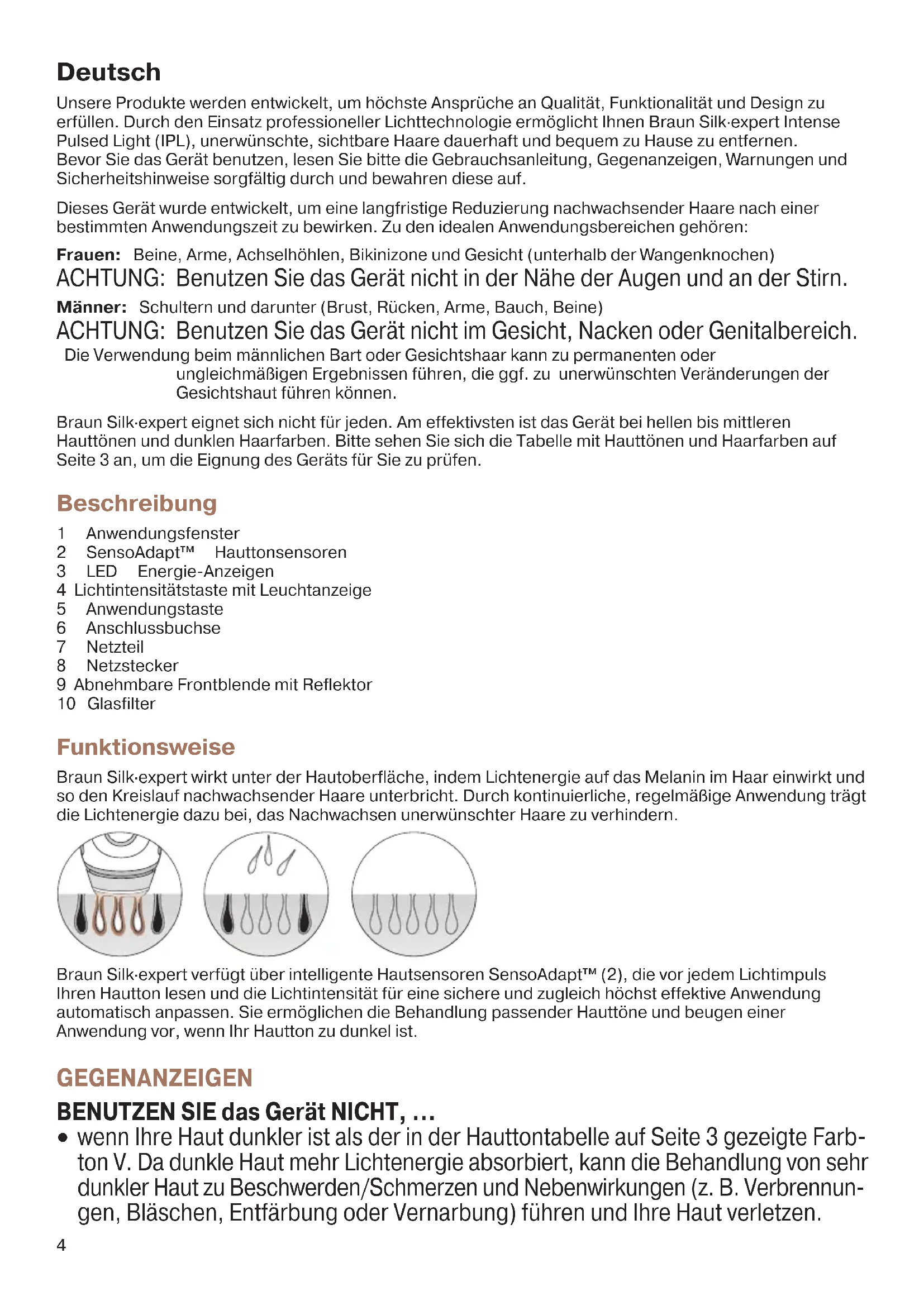 geeignet / suitable / approprié / apto / adequado / adatto / geschikt / egnet / passende / lämplig / sopiinicht geeignet / not suitable / non approprié / uso no apto / não adequado / non adatto / niet geschikt / ikke egnet / ikke passende / inte lämplig / ei sovi käyttöön 90795093_BD5001_A_S3.indd 190795093_BD5001_A_S3.indd 1 03.03.16 08:5903.03.16 08:59 CSS APPROVED Effective Date 8Apr2016 GMT - Printed 27Sep2016 Page 3 of 944 Deutsch Unsere Produkte werden entwickelt, um höchste Ansprüche an Qualität, Funktionalität und Design zu erfüllen. Durch den Einsatz professioneller Lichttechnologie ermöglicht Ihnen Braun Silk·expert Intense Pulsed Light (IPL), unerwünschte, sichtbare Haare dauerhaft und bequem zu Hause zu entfernen. Bevor Sie das Gerät benutzen, lesen Sie bitte die Gebrauchsanleitung, Gegenanzeigen, Warnungen und Sicherheitshinweise sorgfältig durch und bewahren diese auf. Dieses Gerät wurde entwickelt, um eine langfristige Reduzierung nachwachsender Haare nach einer bestimmten Anwendungszeit zu bewirken. Zu den idealen Anwendungsbereichen gehören: Frauen: Beine, Arme, Achselhöhlen, Bikinizone und Gesicht (unterhalb der Wangenknochen) ACHTUNG: Benutzen Sie das Gerät nicht in der Nähe der Augen und an der Stirn. Männer: Schultern und darunter (Brust, Rücken, Arme, Bauch, Beine) ACHTUNG: Benutzen Sie das Gerät nicht im Gesicht, Nacken oder Genitalbereich. Die Verwendung beim männlichen Bart oder Gesichtshaar kann zu permanenten oder ungleichmäßigen Ergebnissen führen, die ggf. zu unerwünschten Veränderungen der Gesichtshaut führen können. Braun Silk·expert eignet sich nicht für jeden. Am effektivsten ist das Gerät bei hellen bis mittleren Hauttönen und dunklen Haarfarben. Bitte sehen Sie sich die Tabelle mit Hauttönen und Haarfarben auf Seite 3 an, um die Eignung des Geräts für Sie zu prüfen. Beschreibung 1 Anwendungsfenster 2 SensoAdapt™ Hauttonsensoren 3 LED Energie-Anzeigen 4 Lichtintensitätstaste mit Leuchtanzeige 5 Anwendungstaste 6 Anschlussbuchse 7 Netzteil 8 Netzstecker 9 Abnehmbare Frontblende mit Reflektor 10 Glasfilter Funktionsweise Braun Silk·expert wirkt unter der Hautoberfläche, indem Lichtenergie auf das Melanin im Haar einwirkt und so den Kreislauf nachwachsender Haare unterbricht. Durch kontinuierliche, regelmäßige Anwendung trägt die Lichtenergie dazu bei, das Nachwachsen unerwünschter Haare zu verhindern. Braun Silk·expert verfügt über intelligente Hautsensoren SensoAdapt™ (2), die vor jedem Lichtimpuls Ihren Hautton lesen und die Lichtintensität für eine sichere und zugleich höchst effektive Anwendung automatisch anpassen. Sie ermöglichen die Behandlung passender Hauttöne und beugen einer Anwendung vor, wenn Ihr Hautton zu dunkel ist. GEGENANZEIGEN BENUTZEN SIE das Gerät NICHT, …
