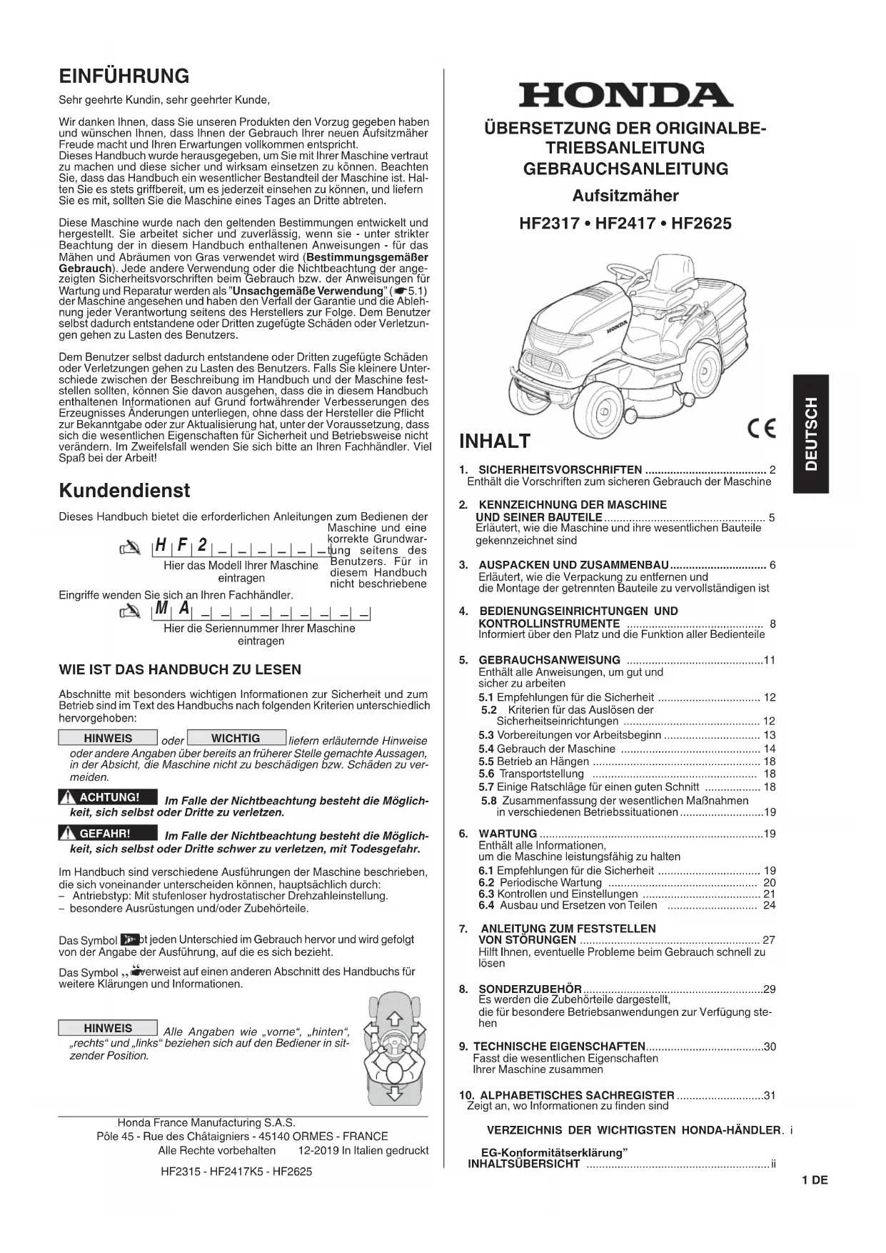 TRIEBSANLEITUNG GEBRAUCHSANLEITUNG HF2317 • HF2417 • HF2625 Aufsitzmäher Honda France Manufacturing S.A.S.Pôle 45 - Rue des Châtaigniers - 45140 ORMES - FRANCEAlle Rechte vorbehaltenHier das Modell Ihrer Maschine eintragen H F 2 _ _ _ _ _ _ Hier die Seriennummer Ihrer Maschine eintragen M A _ _ _ _ _ _ _ _ _ 12-2019 In Italien gedrucktHF2315 - HF2417K5 - HF2625 DEUTSCH4) ACHTUNG: GEFAHR! Benzin ist hochgradig entammbar. - Den Kraftsto ausschließlich in eigens für Kraftstoe zugelassenen Behältern aufbewahren und zwar an einem sicheren Ort, fern von Wärmequellen oder oenen Flammen. Die Behälter niemals in Reichweite von Kindern aufbewahren. - Tanken Sie nur im Freien und benutzen Sie einen Trichter. Nicht rau- chen, während Sie tanken und immer wenn Sie Benzin handhaben; - Benzin ist vor dem Starten des Motors einzufüllen. Während der Motor läuft oder bei heißer Maschine darf der Tankverschluss nicht geönet bzw. Benzin nachgefüllt werden; - Falls Benzin übergelaufen ist, darf kein Versuch unternommen werden, den Motor zu starten. Stattdessen ist die Maschine von der benzinverschmutzten Fläche zu entfernen. Bis das Benzin vollständig verdampft ist und die Benzindämpfe verüchtigt sind, vermeiden Sie alles, was einen Brand verursachen könnte; - Tankverschluss und Verschluss des Benzinbehälters müssen im- mer gut zugeschraubt sein. - Vermeiden, die Dämpfe des Kraftstos einzuatmen. - Tankverschluss langsam önen, um den darin entstandenen Druck langsam abzubauen. - Maschine nicht am Befüllungsort starten. Der Motor darf erst an- gelassen werden, wenn er mindestens 3 m vom Kraftsto-Befül- lungsort entfernt ist. - Den Kontakt von Kraftsto mit Kleidung vermeiden. Andernfalls die Kleidung wechseln, bevor der Motor gestartet wird.