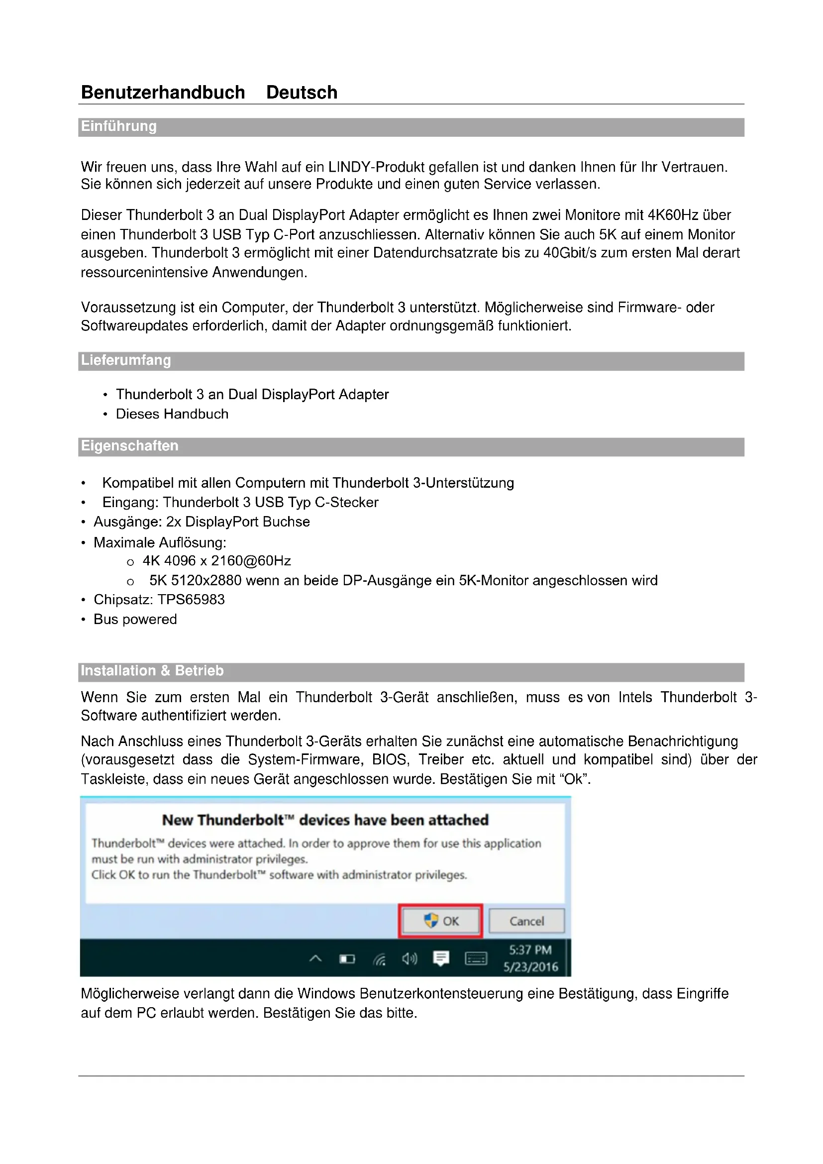 Installation & Betrieb Wenn Sie zum ersten Mal ein Thunderbolt 3-Gerät anschließen, muss es von Intels Thunderbolt 3- Software authentifiziert werden. Nach Anschluss eines Thunderbolt 3-Geräts erhalten Sie zunächst eine automatische Benachrichtigung (vorausgesetzt dass die System-Firmware, BIOS, Treiber etc. aktuell und kompatibel sind) über der Taskleiste, dass ein neues Gerät angeschlossen wurde. Bestätigen Sie mit “Ok”. Möglicherweise verlangt dann die Windows Benutzerkontensteuerung eine Bestätigung, dass Eingriffe auf dem PC erlaubt werden. Bestätigen Sie das bitte.Benutzerhandbuch Deutsch