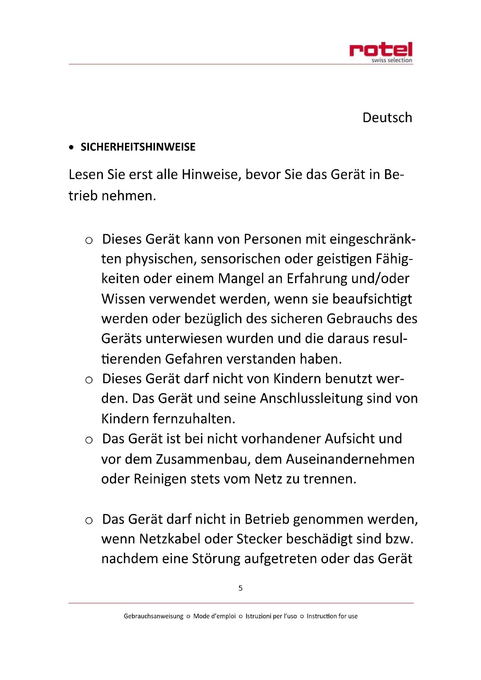 Deutsch SICHERHEITSHINWEISE Lesen Sie erst alle Hinweise, bevor Sie das Gerät in Be- trieb nehmen. o Dieses Gerät kann von Personen mit eingeschränk- ten physischen, sensorischen oder geistigen Fähig- keiten oder einem Mangel an Erfahrung und/oder Wissen verwendet werden, wenn sie beaufsichtigt werden oder bezüglich des sicheren Gebrauchs des Geräts unterwiesen wurden und die daraus resul- tierenden Gefahren verstanden haben. o Dieses Gerät darf nicht von Kindern benutzt wer- den. Das Gerät und seine Anschlussleitung sind von Kindern fernzuhalten. o Das Gerät ist bei nicht vorhandener Aufsicht und vor dem Zusammenbau, dem Auseinandernehmen oder Reinigen stets vom Netz zu trennen. o Das Gerät darf nicht in Betrieb genommen werden, wenn Netzkabel oder Stecker beschädigt sind bzw. nachdem eine Störung aufgetreten oder das GerätGebrauchsanweisung ○ Mode d’emploi ○ Istruzioni per l’uso ○ Instruction for use