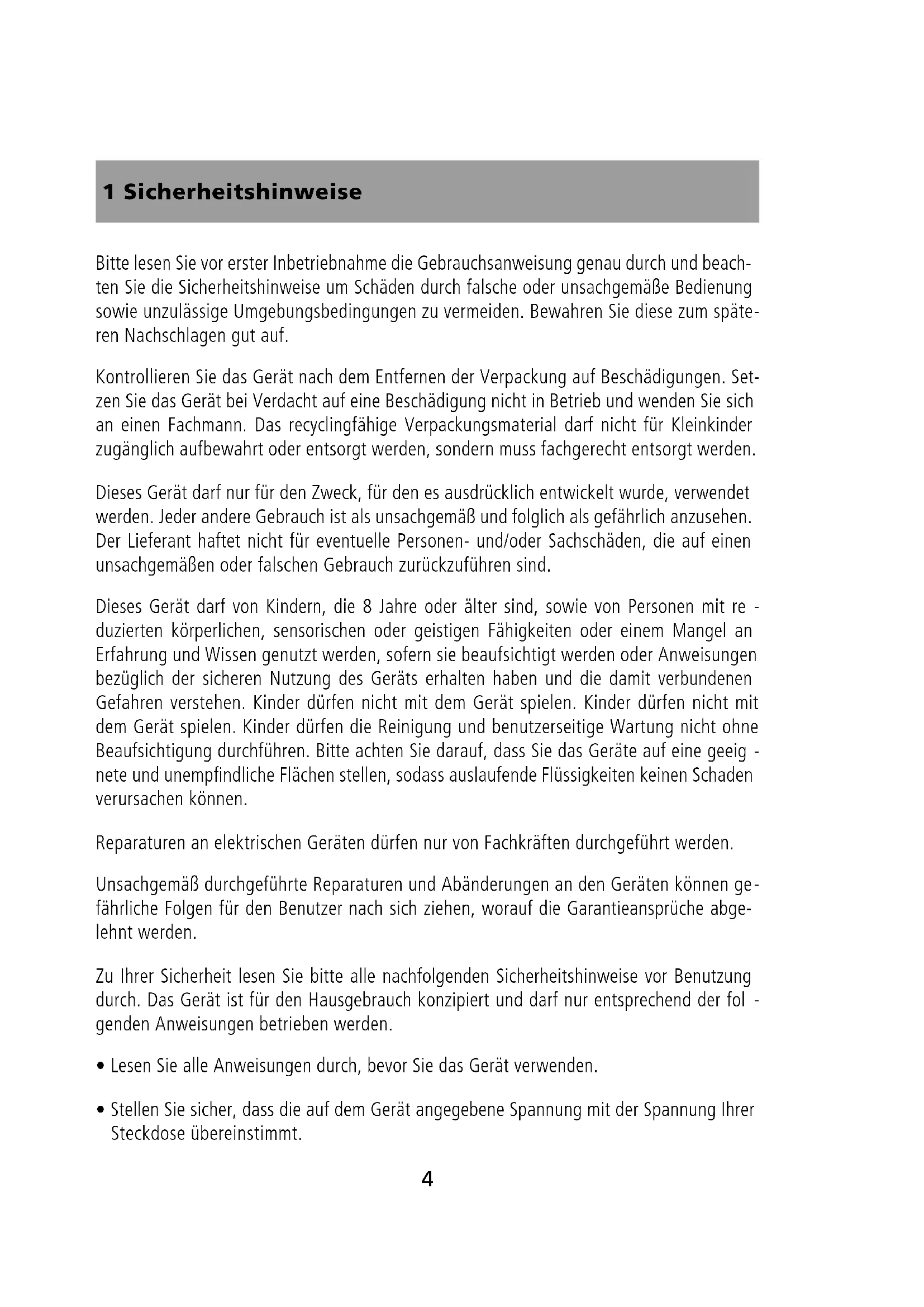 fährliche Folgen für den Benutzer nach sich ziehen, worauf die Garantieansprüche abge- lehnt werden. Zu Ihrer Sicherheit lesen Sie bitte alle nachfolgenden Sicherheitshinweise vor Benutzung durch. Das Gerät ist für den Hausgebrauch konzipiert und darf nur entsprechend der fol