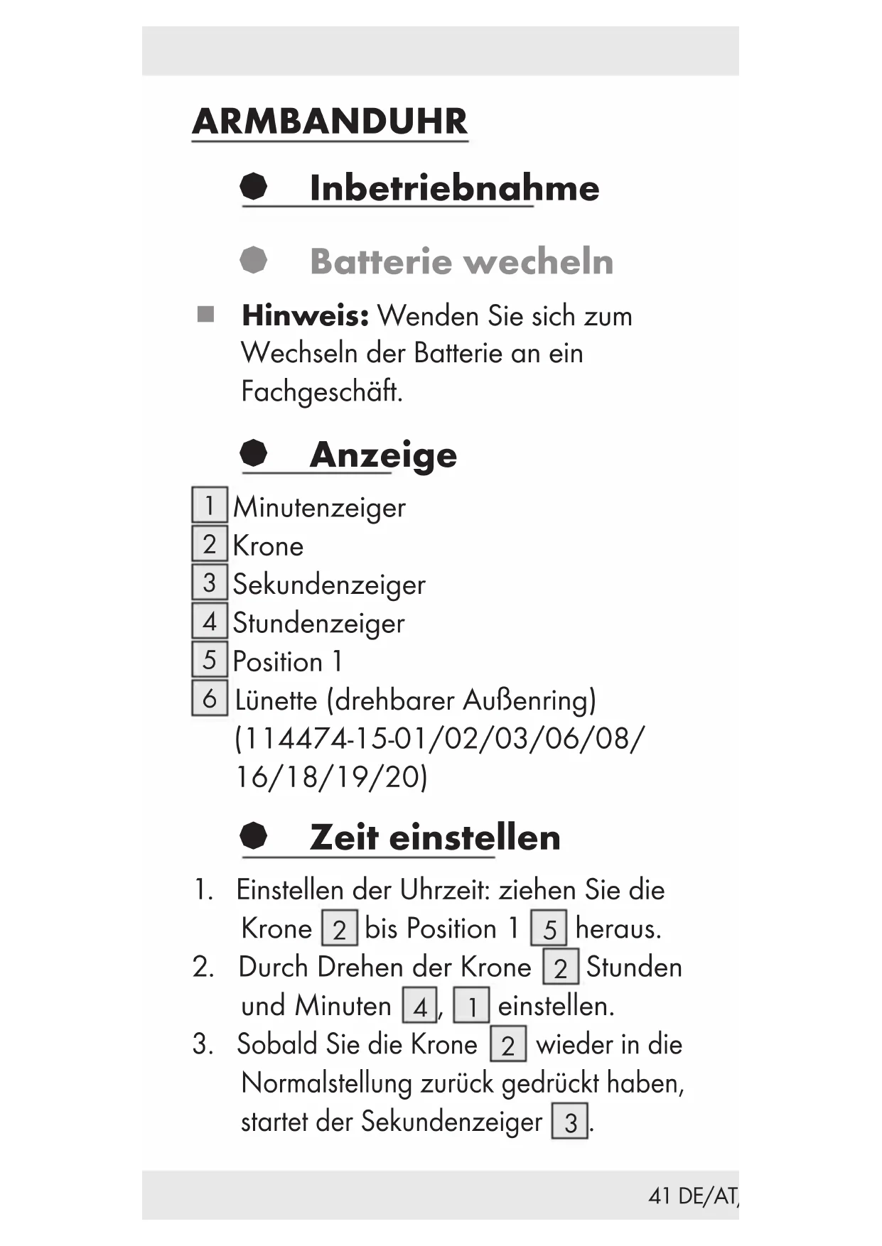 Laden Sie die Anleitung für Ihr Uhr kostenlos im PDF-Format! Finden Sie Ihr Handbuch IAN 114474 - AURIOL und nehmen Sie Ihr elektronisches Gerät wieder in die Hand. Auf dieser Seite sind alle Dokumente veröffentlicht, die für die Verwendung Ihres Geräts notwendig sind. IAN 114474 von der Marke AURIOL.