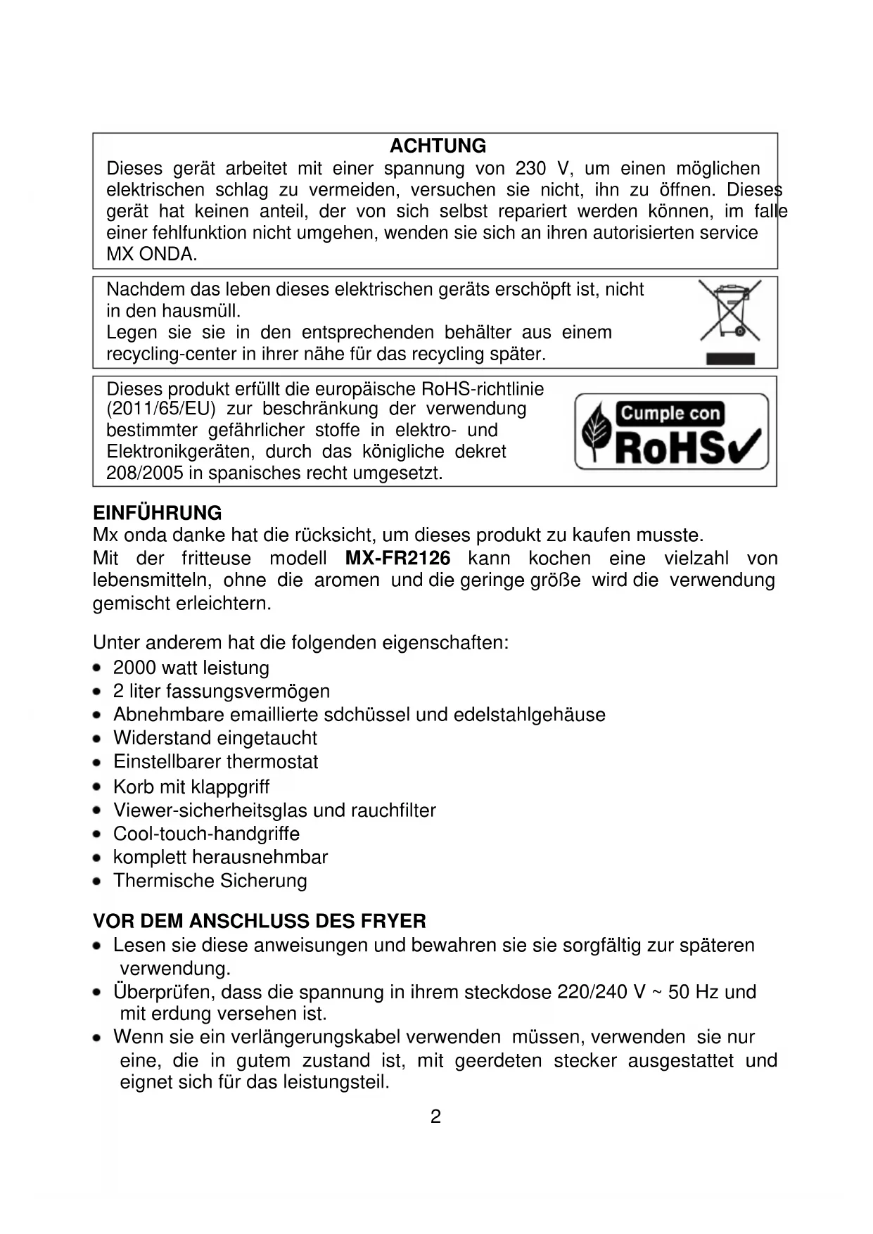 Dieses gerät arbeitet mit einer spannung von 230 V, um einen möglichen elektrischen schlag zu vermeiden, versuchen sie nicht,ihn zu öffnen. Dieses gerät hat keinen anteil, der von sich selbst repariert werden konnen, im falle einer fehlfungtion nicht umgehen, wenden sie sich an ihren autorisierten service MX ONDA.