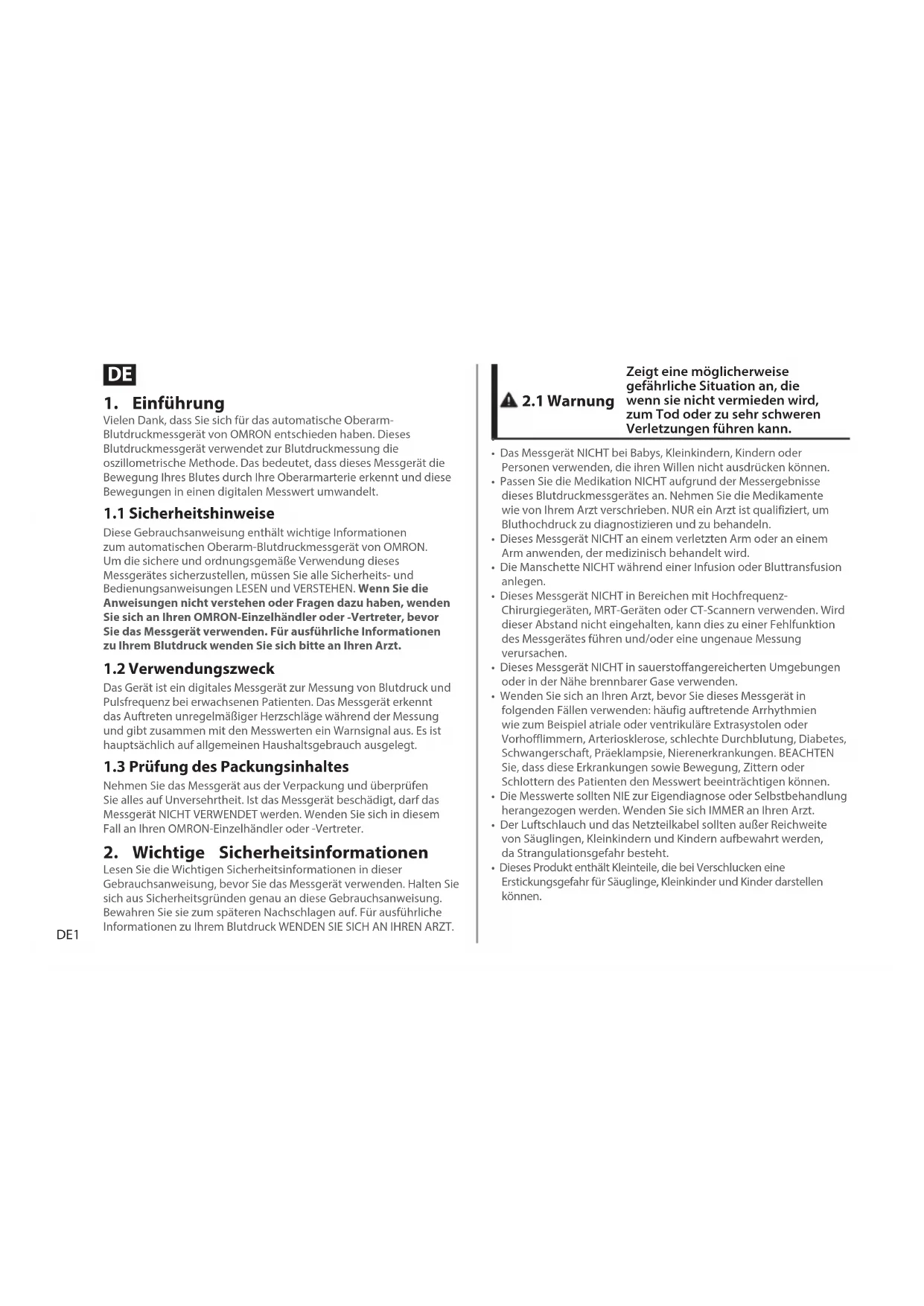 Diese Gebrauchsanweisung enthält wichtige Informationen zum automatischen Oberarm-Blutdruckmessgerät von OMRON. Um die sichere und ordnungsgemäße Verwendung dieses Messgerätes sicherzustellen, müssen Sie alle Sicherheits- und Bedienungsanweisungen LESEN und VERSTEHEN. Wenn Sie die Anweisungen nicht verstehen oder Fragen dazu haben, wenden Sie sich an Ihren OMRON-Einzelhändler oder -Vertreter, bevor Sie das Messgerät verwenden. Für ausführliche Informationen zuIhrem Blutdruck wenden Sie sich bitte an Ihren Arzt.