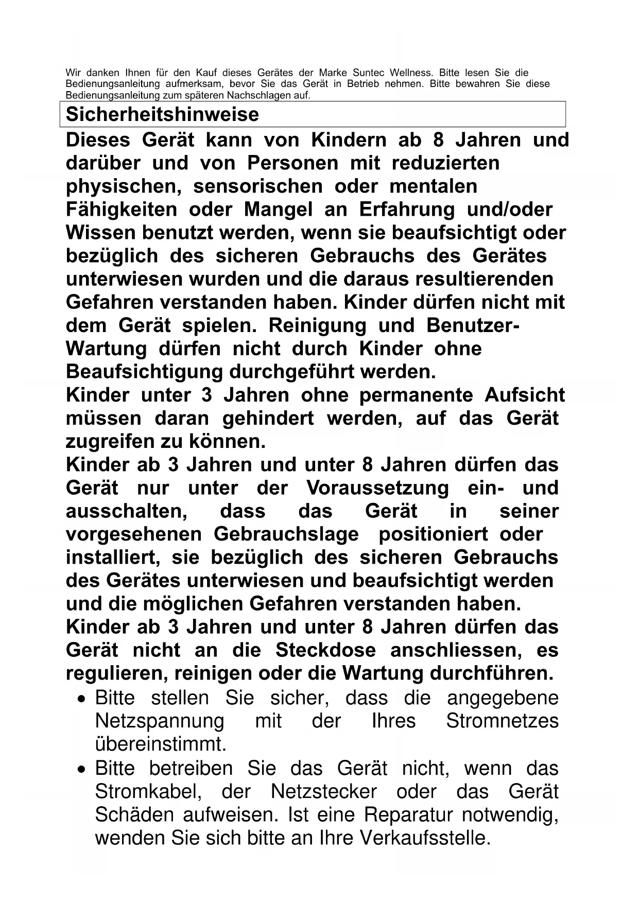 BedienungsanleitungWir danken Ihnen für den Kauf dieses Gerätes der Marke Suntec Wellness. Bitte lesen Sie die Bedienungsanleitung aufmerksam, bevor Sie das Gerät in Betrieb nehmen. Bitte bewahren Sie diese Bedienungsanleitung zum späteren Nachschlagen auf. Sicherheitshinweise Dieses Gerät kann von Kindern ab 8 Jahren und darüber und von Personen mit reduzierten physischen, sensorischen oder mentalen Fähigkeiten oder Mangel an Erfahrung und/oder Wissen benutzt werden, wenn sie beaufsichtigt oder bezüglich des sicheren Gebrauchs des Gerätes unterwiesen wurden und die daraus resultierenden Gefahren verstanden haben. Kinder dürfen nicht mit dem Gerät spielen. Reinigung und Benutzer- Wartung dürfen nicht durch Kinder ohne Beaufsichtigung durchgeführt werden. Kinder unter 3 Jahren ohne permanente Aufsicht müssen daran gehindert werden, auf das Gerät zugreifen zu können. Kinder ab 3 Jahren und unter 8 Jahren dürfen das Gerät nur unter der Voraussetzung ein- und ausschalten, dass das Gerät in seiner vorgesehenen Gebrauchslage positioniert oder installiert, sie bezüglich des sicheren Gebrauchs des Gerätes unterwiesen und beaufsichtigt werden und die möglichen Gefahren verstanden haben. Kinder ab 3 Jahren und unter 8 Jahren dürfen das Gerät nicht an die Steckdose anschliessen, es regulieren, reinigen oder die Wartung durchführen.