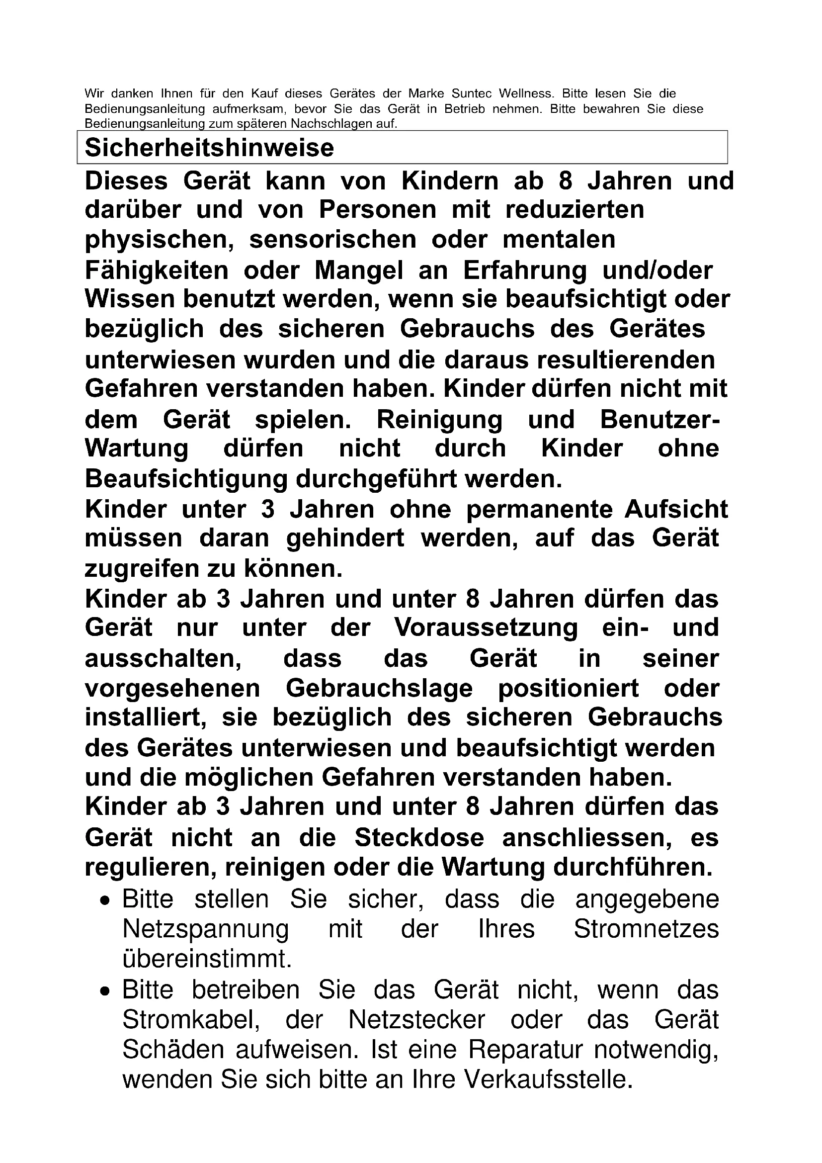 BedienungsanleitungWir danken Ihnen für den Kauf dieses Gerätes der Marke Suntec Wellness. Bitte lesen Sie die Bedienungsanleitung aufmerksam, bevor Sie das Gerät in Betrieb nehmen. Bitte bewahren Sie diese Bedienungsanleitung zum späteren Nachschlagen auf. Sicherheitshinweise Dieses Gerät kann von Kindern ab 8 Jahren und darüber und von Personen mit reduzierten physischen, sensorischen oder mentalen Fähigkeiten oder Mangel an Erfahrung und/oder Wissen benutzt werden, wenn sie beaufsichtigt oder bezüglich des sicheren Gebrauchs des Gerätes unterwiesen wurden und die daraus resultierenden Gefahren verstanden haben. Kinder dürfen nicht mit dem Gerät spielen. Reinigung und Benutzer- Wartung dürfen nicht durch Kinder ohne Beaufsichtigung durchgeführt werden. Kinder unter 3 Jahren ohne permanente Aufsicht müssen daran gehindert werden, auf das Gerät zugreifen zu können. Kinder ab 3 Jahren und unter 8 Jahren dürfen das Gerät nur unter der Voraussetzung ein- und ausschalten, dass das Gerät in seiner vorgesehenen Gebrauchslage positioniert oder installiert, sie bezüglich des sicheren Gebrauchs des Gerätes unterwiesen und beaufsichtigt werden und die möglichen Gefahren verstanden haben. Kinder ab 3 Jahren und unter 8 Jahren dürfen das Gerät nicht an die Steckdose anschliessen, es regulieren, reinigen oder die Wartung durchführen.
