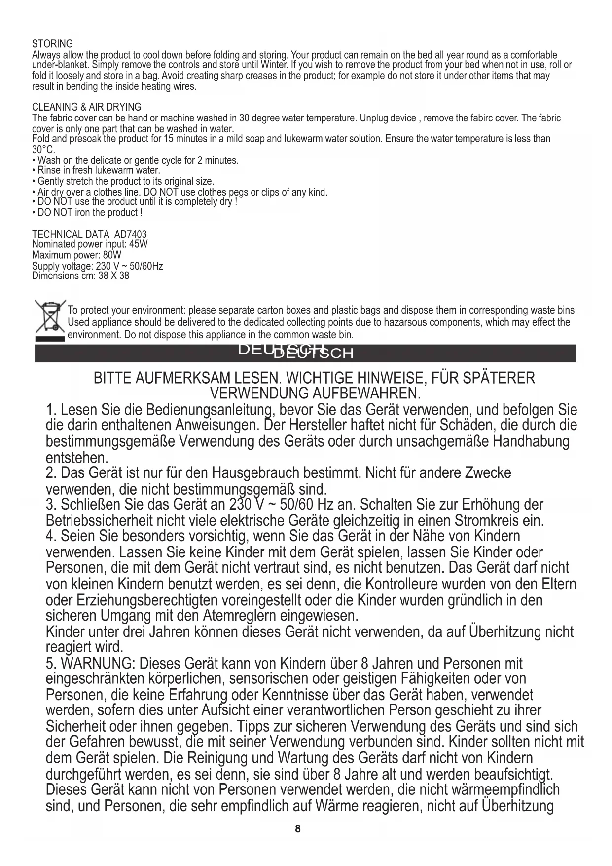bestimmungsgemäßer Verwendung des Geräts nicht funktionieren sollte. Wenn die Sicherung auslöst, funktioniert das Gerät nicht mehr. Das Gerät muss zur Reparatur an den Hersteller oder seinen Vertreter geschickt werden. Produkt: Elektrisches Heizkissen AD7403