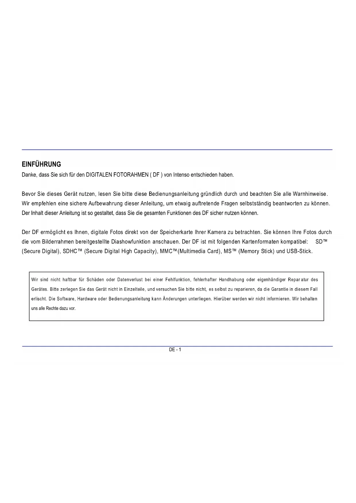 Danke, dass Sie sich für den DIGITALEN FOTORAHMEN (DF) von Intenso entschieden haben.