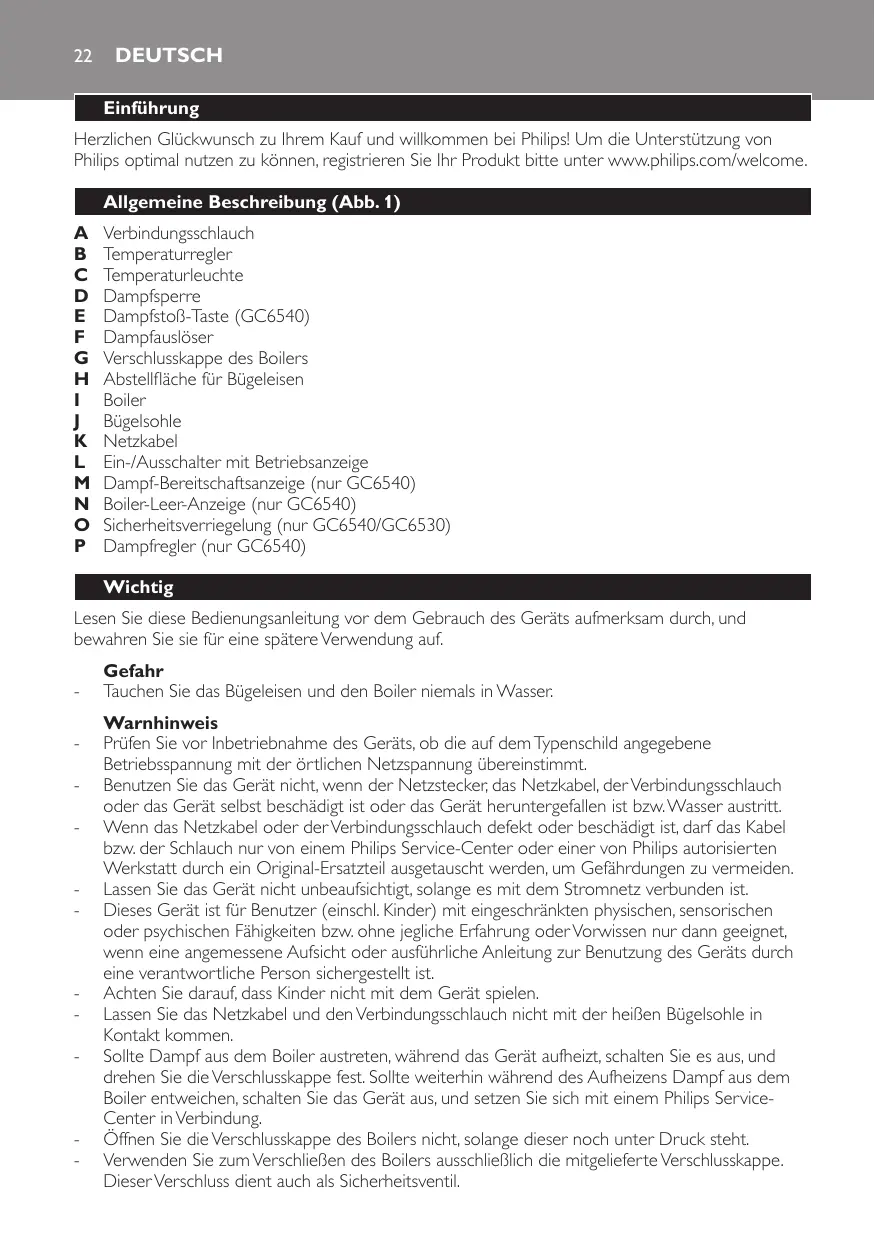 Lesen Sie diese Bedienungsanleitung vor dem Gebrauch des Geräts aufmerksam durch, und bewahren Sie sie für eine spätere Verwendung auf. Gefahr -- Tauchen Sie das Bügeleisen und den Boiler niemals in Wasser. Warnhinweis -- Prüfen Sie vor Inbetriebnahme des Geräts, ob die auf dem Typenschild angegebene Betriebsspannung mit der örtlichen Netzspannung übereinstimmt. -- Benutzen Sie das Gerät nicht, wenn der Netzstecker, das Netzkabel, der Verbindungsschlauch oder das Gerät selbst beschädigt ist oder das Gerät heruntergefallen ist bzw. Wasser austritt. -- Wenn das Netzkabel oder der Verbindungsschlauch defekt oder beschädigt ist, darf das Kabel bzw. der Schlauch nur von einem Philips Service-Center oder einer von Philips autorisierten Werkstatt durch ein Original-Ersatzteil ausgetauscht werden, um Gefährdungen zu vermeiden. -- Lassen Sie das Gerät nicht unbeaufsichtigt, solange es mit dem Stromnetz verbunden ist. -- Dieses Gerät ist für Benutzer (einschl. Kinder) mit eingeschränkten physischen, sensorischen oder psychischen Fähigkeiten bzw. ohne jegliche Erfahrung oder Vorwissen nur dann geeignet, wenn eine angemessene Aufsicht oder ausführliche Anleitung zur Benutzung des Geräts durch eine verantwortliche Person sichergestellt ist. -- Achten Sie darauf, dass Kinder nicht mit dem Gerät spielen. -- Lassen Sie das Netzkabel und den Verbindungsschlauch nicht mit der heißen Bügelsohle in Kontakt kommen. -- Sollte Dampf aus dem Boiler austreten, während das Gerät aufheizt, schalten Sie es aus, und drehen Sie die Verschlusskappe fest. Sollte weiterhin während des Aufheizens Dampf aus dem Boiler entweichen, schalten Sie das Gerät aus, und setzen Sie sich mit einem Philips ServiceCenter in Verbindung. -- Öffnen Sie die Verschlusskappe des Boilers nicht, solange dieser noch unter Druck steht. -- Verwenden Sie zum Verschließen des Boilers ausschließlich die mitgelieferte Verschlusskappe. Dieser Verschluss dient auch als Sicherheitsventil.