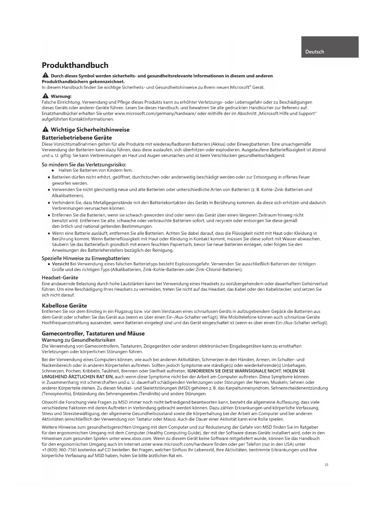 Gerät. Warnung: Falsche Einrichtung, Verwendung und Pfl ege dieses Produkts kann zu erhöhter Verletzungs- oder Lebensgefahr oder zu Beschädigungen dieses Geräts oder anderer Geräte führen. Lesen Sie dieses Handbuch, und bewahren Sie alle gedruckten Handbücher zur Referenz auf. Ersatzhandbücher erhalten Sie unter www.microsoft.com/germany/hardware/ oder mithilfe der im Abschnitt „Microsoft Hilfe und Support“ aufgeführten Kontaktinformationen. Wichtige Sicherheitshinweise Batteriebetriebene Geräte Diese Vorsichtsmaßnahmen gelten für alle Produkte mit wiederaufl adbaren Batterien (Akkus) oder Einwegbatterien. Eine unsachgemäße Verwendung der Batterien kann dazu führen, dass diese auslaufen, sich überhitzen oder explodieren. Ausgelaufene Batteriefl üssigkeit ist ätzend und u. U. giftig. Sie kann Verbrennungen an Haut und Augen verursachen und ist beim Verschlucken gesundheitsschädigend. So mindern Sie das Verletzungsrisiko: ● Halten Sie Batterien von Kindern fern. ● Batterien dürfen nicht erhitzt, geöffnet, durchstochen oder anderweitig beschädigt werden oder zur Entsorgung in offenes Feuer geworfen werden. ● Verwenden Sie nicht gleichzeitig neue und alte Batterien oder unterschiedliche Arten von Batterien (z. B. Kohle-Zink-Batterien und Alkalibatterien). ● Verhindern Sie, dass Metallgegenstände mit den Batteriekontakten des Geräts in Berührung kommen, da diese sich erhitzen und dadurch Verbrennungen verursachen können. ● Entfernen Sie die Batterien, wenn sie schwach geworden sind oder wenn das Gerät über einen längeren Zeitraum hinweg nicht benutzt wird. Entfernen Sie alte, schwache oder verbrauchte Batterien sofort, und recyceln oder entsorgen Sie diese gemäß den örtlich und national geltenden Bestimmungen. ● Wenn eine Batterie ausläuft, entfernen Sie alle Batterien. Achten Sie dabei darauf, dass die Flüssigkeit nicht mit Haut oder Kleidung in Berührung kommt. Wenn Batterieflüssigkeit mit Haut oder Kleidung in Kontakt kommt, müssen Sie diese sofort mit Wasser abwaschen. Säubern Sie das Batteriefach gründlich mit einem feuchten Papiertuch, bevor Sie neue Batterien einlegen, oder folgen Sie den Anweisungen des Batterieherstellers bezüglich der Reinigung. Spezielle Hinweise zu Einwegbatterien: ● Vorsicht Bei Verwendung eines falschen Batterietyps besteht Explosionsgefahr. Verwenden Sie ausschließlich Batterien der richtigen Größe und des richtigen Typs (Alkalibatterien, Zink-Kohle-Batterien oder Zink-Chlorid-Batterien). Headset-Geräte Eine andauernde Belastung durch hohe Lautstärken kann bei Verwendung eines Headsets zu vorübergehendem oder dauerhaftem Gehörverlust führen. Um eine Beschädigung Ihres Headsets zu vermeiden, treten Sie nicht auf das Headset, das Kabel oder den Kabelstecker, und setzen Sie sich nicht darauf. Kabellose Geräte Entfernen Sie vor dem Einstieg in ein Flugzeug bzw. vor dem Verstauen eines schnurlosen Geräts in aufzugebendem Gepäck die Batterien aus dem Gerät oder schalten Sie das Gerät aus (wenn es über einen Ein-/Aus-Schalter verfügt). Wie Mobiltelefone können auch schnurlose Geräte Hochfrequenzstrahlung aussenden, wenn Batterien eingelegt sind und das Gerät eingeschaltet ist (wenn es über einen Ein-/Aus-Schalter verfügt). Gamecontroller, Tastaturen und Mäuse Warnung zu Gesundheitsrisiken Die Verwendung von Gamecontrollern, Tastaturen, Zeigegeräten oder anderen elektronischen Eingabegeräten kann zu ernsthaften Verletzungen oder körperlichen Störungen führen. Bei der Verwendung eines Computers können, wie auch bei anderen Aktivitäten, Schmerzen in den Händen, Armen, im Schulter- und Nackenbereich oder in anderen Körperteilen auftreten. Sollten jedoch Symptome wie ständige(s) oder wiederkehrende(s) Unbehagen, Schmerzen, Pochen, Kribbeln, Taubheit, Brennen oder Steifheit auftreten, IGNORIEREN SIE DIESE WARNSIGNALE NICHT. HOLEN SIE UMGEHEND ÄRZTLICHEN RAT EIN, auch wenn diese Symptome nicht bei der Arbeit am Computer auftreten. Diese Symptome können in Zusammenhang mit schmerzhaften und u. U. dauerhaft schädigenden Verletzungen oder Störungen der Nerven, Muskeln, Sehnen oder anderer Körperteile stehen. Zu diesen Muskel- und Skelettstörungen (MSD) gehören z. B. das Karpaltunnelsyndrom, Sehnenscheidenentzündung (Tenosynovitis), Entzündung des Sehnengewebes (Tendinitis) und andere Störungen. Obwohl die Forschung viele Fragen zu MSD immer noch nicht befriedigend beantworten kann, besteht die allgemeine Auffassung, dass viele verschiedene Faktoren mit deren Auftreten in Verbindung gebracht werden können. Dazu zählen Erkrankungen und körperliche Verfassung, Stress und Stressbewältigung, der allgemeine Gesundheitszustand sowie die Körperhaltung bei der Arbeit am Computer und bei anderen Aktivitäten (einschließlich der Verwendung von Tastatur oder Maus). Auch die Dauer einer Aktivität kann eine Rolle spielen. Weitere Hinweise zum gesundheitsgerechten Umgang mit dem Computer und zur Reduzierung der Gefahr von MSD fi nden Sie im Ratgeber für den ergonomischen Umgang mit dem Computer (Healthy Computing Guide), der mit der Software dieses Geräts installiert wird, oder in den Hinweisen zum gesunden Spielen unter www.xbox.com. Wenn zu diesem Gerät keine Software mitgeliefert wurde, können Sie das Handbuch für den ergonomischen Umgang auch im Internet unter www.microsoft.com/hardware fi nden oder per Telefon (nur in den USA) unter +1 (800) 360-7561 kostenlos auf CD bestellen. Bei Fragen, welchen Einfl uss Ihr Lebensstil, Ihre Aktivitäten, bestimmte Erkrankungen und Ihre körperliche Verfassung auf MSD haben, holen Sie bitte ärztlichen Rat ein. Deutsch26 Anfälle auf Grund von Photosensibilität Eine sehr geringe Zahl von Menschen erleidet u. U. Anfälle, wenn sie bestimmten visuellen Reizen ausgesetzt sind, wie z. B. Blitzlichter oder Lichtreize in Videospielen. Auch bei Menschen, die zuvor keine derartigen Anfälle erlitten haben und auch nicht an Epilepsie erkrankt sind, 