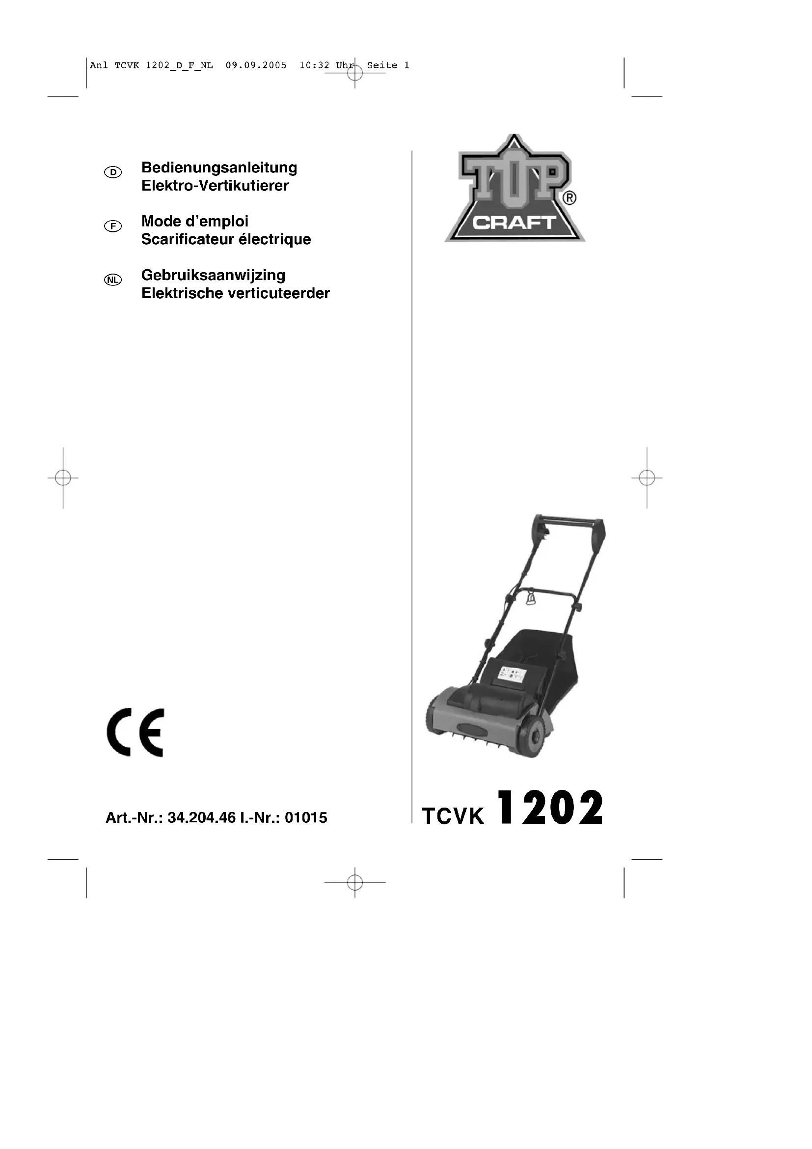 Gebruiksaanwijzing Elektrische verticuteerder Art.-Nr.: 34.204.46 I.-Nr.: 01015 TCVK 1202 Anl TCVK 1202_D_F_NL 09.09.2005 10:32 Uhr Seite 12 Bitte Seiten 2-5 ausklappen Veuillez déplier les pages 2 à 5 Gelieve blz. 2-5 uit te vouwen Anl TCVK 1202_D_F_NL 09.09.2005 10:32 Uhr Seite 23