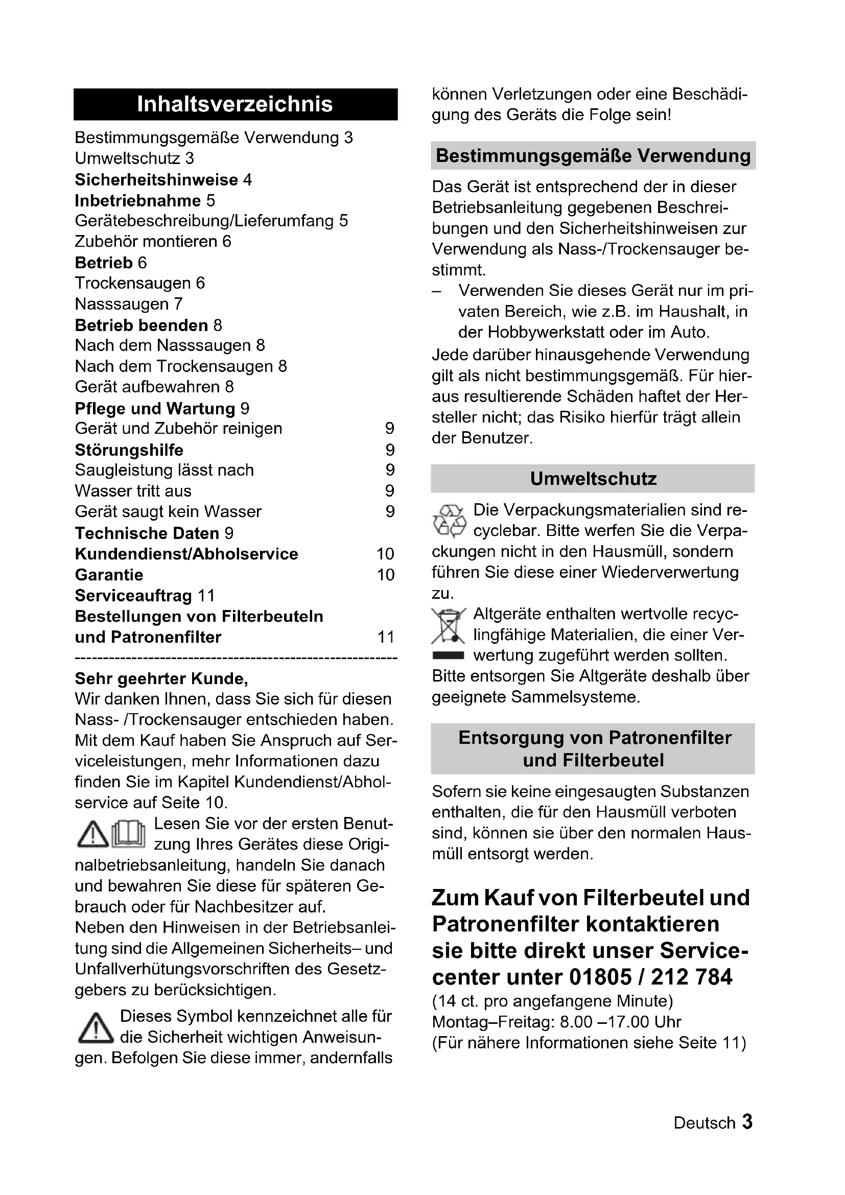 332Deutsch 3 Bestimmungsgemäße Verwendung 3 Umweltschutz 3 Sicherheitshinweise 4 Inbetriebnahme 5 Gerätebeschreibung/Lieferumfang 5 Zubehör montieren 6 Betrieb 6 Trockensaugen 6 Nasssaugen 7 Betrieb beenden 8 Nach dem Nasssaugen 8 Nach dem Trockensaugen 8 Gerät aufbewahren 8 Pflege und Wartung 9 Gerät und Zubehör reinigen 9 Störungshilfe 9 Saugleistung lässt nach 9 Wasser tritt aus 9 Gerät saugt kein Wasser 9 Technische Daten 9 Kundendienst/Abholservice 10 Garantie 10 Serviceauftrag 11 Bestellungen von Filterbeuteln und Patronenfilter 11