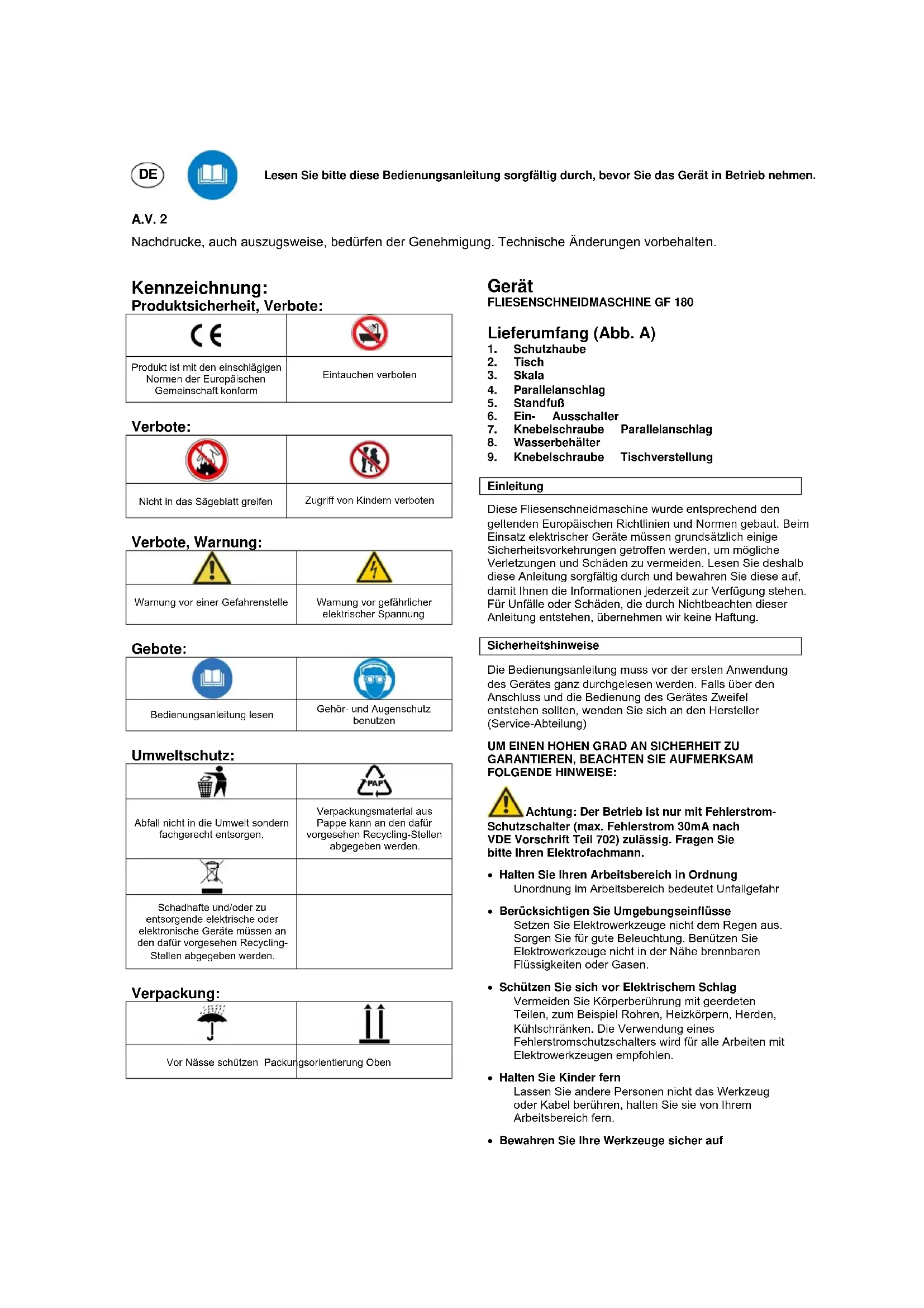 Gerät FLIESENSCHNEIDMASCHINE GF 180 Lieferumfang (Abb. A) 1. Schutzhaube 2. Tisch 3. Skala 4. Parallelanschlag 5. Standfuß 6. Ein- Ausschalter 7. Knebelschraube Parallelanschlag 8. Wasserbehälter 9. Knebelschraube Tischverstellung Einleitung Diese Fliesenschneidmaschine wurde entsprechend den geltenden Europäischen Richtlinien und Normen gebaut. Beim Einsatz elektrischer Geräte müssen grundsätzlich einige Sicherheitsvorkehrungen getroffen werden, um mögliche Verletzungen und Schäden zu vermeiden. Lesen Sie deshalb diese Anleitung sorgfältig durch und bewahren Sie diese auf, damit Ihnen die Informationen jederzeit zur Verfügung stehen. Für Unfälle oder Schäden, die durch Nichtbeachten dieser Anleitung entstehen, übernehmen wir keine Haftung. Sicherheitshinweise Die Bedienungsanleitung muss vor der ersten Anwendung des Gerätes ganz durchgelesen werden. Falls über den Anschluss und die Bedienung des Gerätes Zweifel entstehen sollten, wenden Sie sich an den Hersteller (Service-Abteilung) UM EINEN HOHEN GRAD AN SICHERHEIT ZU GARANTIEREN, BEACHTEN SIE AUFMERKSAM FOLGENDE HINWEISE: Achtung: Der Betrieb ist nur mit Fehlerstrom- Schutzschalter (max. Fehlerstrom 30mA nach VDE Vorschrift Teil 702) zulässig. Fragen Sie bitte Ihren Elektrofachmann. Halten Sie Ihren Arbeitsbereich in Ordnung Unordnung im Arbeitsbereich bedeutet Unfallgefahr Berücksichtigen Sie Umgebungseinflüsse Setzen Sie Elektrowerkzeuge nicht dem Regen aus. Sorgen Sie für gute Beleuchtung. Benützen Sie Elektrowerkzeuge nicht in der Nähe brennbaren Flüssigkeiten oder Gasen. Schützen Sie sich vor Elektrischem Schlag Vermeiden Sie Körperberührung mit geerdeten Teilen, zum Beispiel Rohren, Heizkörpern, Herden, Kühlschränken. Die Verwendung eines Fehlerstromschutzschalters wird für alle Arbeiten mit Elektrowerkzeugen empfohlen. Halten Sie Kinder fern Lassen Sie andere Personen nicht das Werkzeug oder Kabel berühren, halten Sie sie von Ihrem Arbeitsbereich fern. Bewahren Sie Ihre Werkzeuge sicher aufUnbenutzte Werkzeuge sollten in trockenen, verschlossenen Raum und für Kinder nicht erreichbar aufbewahrt werden. Überlasten Sie Ihr Werkzeug nicht. Sie arbeiten besser und sicherer im angegebenen Leistungsbereich. Benützen Sie das richtige Werkzeug Verwenden Sie keine zu schwachen Werkzeuge für schwere Arbeiten. Benützen Sie Werkzeuge nicht für Zwecke und Arbeiten wofür Sie nicht bestimmt sind. Tragen Sie geeignete Arbeitskleidung Tragen Sie keine weite Kleidung oder Schmuck. Sie können von beweglichen Teilen erfaßt werden. Beim Arbeiten im Freien sind Gummihandschuhe und rutschfestes Schuhwerk empfehlenswert. Tragen Sie bei langen Haaren ein Haarnetz. Benützen Sie eine Schutzbrille und eine Atemmaske Verwenden Sie immer eine Schutzbrille und bei stauberzeugenden Arbeiten eine Atemmaske. Schutzhaube Die Diamant –Trennscheiben – Schutzhaube muss immer benutzt werden. Zweckentfremden Sie nicht das Kabel Tragen Sie das Werkzeug nicht am Kabel, und nützen Sie dieses nicht, um den Stecker aus der Steckdose zu ziehen. schützen Sie das Kabel vor Hitze, Öl und scharfen Kanten. Sichern Sie das Werkstück Führen Sie das Werkstück mit einem Schiebestock oder Schiebeholz an die laufende Diamant– Trennscheibe heran. Achten Sie auf gleichmäßigen Vorschub.