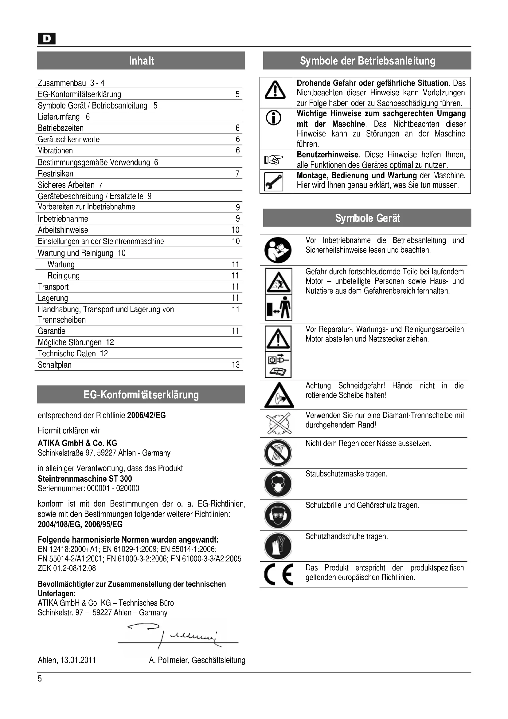 entsprechend der Richtlinie 2006/42/EG Hiermit erklären wir ATIKA GmbH & Co. KG Schinkelstraße 97, 59227 Ahlen - Germany in alleiniger Verantwortung, dass das Produkt Steintrennmaschine ST 300 Seriennummer: 000001 - 020000 konform ist mit den Bestimmungen der o. a. EG-Richtlinien, sowie mit den Bestimmungen folgender weiterer Richtlinien: 2004/108/EG, 2006/95/EG Folgende harmonisierte Normen wurden angewandt: EN 12418:2000+A1; EN 61029-1:2009; EN 55014-1:2006; EN 55014-2/A1:2001; EN 61000-3-2:2006; EN 61000-3-3/A2:2005 ZEK 01.2-08/12.08 Bevollmächtigter zur Zusammenstellung der technischen Unterlagen: ATIKA GmbH & Co. KG – Technisches Büro Schinkelstr. 97 – 59227 Ahlen – Germany Ahlen, 13.01.2011 A. Pollmeier, Geschäftsleitung