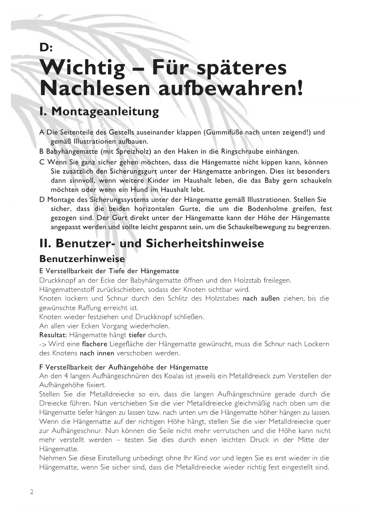 Wird eine flachere Liegefläche der Hängematte gewünscht, muss die Schnur nach Lockern des Knotens nach innen verschoben werden. F Verstellbarkeit der Aufhängehöhe der Hängematte An den 4 langen Aufhängeschnüren des Koalas ist jeweils ein Metalldreieck zum Verstellen der Aufhängehöhe fixiert. Stellen Sie die Metalldreiecke so ein, dass die langen Aufhängeschnüre gerade durch die Dreiecke führen. Nun verschieben Sie die vier Metalldreiecke gleichmäßig nach oben um die Hängematte tiefer hängen zu lassen bzw. nach unten um die Hängematte höher hängen zu lassen. Wenn die Hängematte auf der richtigen Höhe hängt, stellen Sie die vier Metalldreiecke quer zur Aufhängeschnur. Nun können die Seile nicht mehr verrutschen und die Höhe kann nicht mehr verstellt werden – testen Sie dies durch einen leichten Druck in der Mitte der Hängematte. Nehmen Sie diese Einstellung unbedingt ohne Ihr Kind vor und legen Sie es erst wieder in die Hängematte, wenn Sie sicher sind, dass die Metalldreiecke wieder richtig fest eingestellt sind. 120626_Koala_Anleitung_des3_DIN A5 26.06.12 10:02 Seite 2Garantierte Mobilität Die Babyhängematte Koala eignet sich für den Gebrauch indoor als auch outdoor genauso wie für den Hausgebrauch oder als Reisebettchen. Mobilität und Flexiblität – so heißt das Motto dieser einfach zu transportierenden Babyhängematte mit Klappgestell. Hängematte bevorzugt Wird ein Kind geboren, fühlt es sich zunächst um den Schutzmechanismus und das Gefühl der Geborgenheit aus dem Mutterleib beraubt. In der Hängematte hingegen fühlt sich das Baby fast so geborgen wie im Mutterleib. Embryonalstellung (als wärmende Unterlage empfehlen wir die Decke Sunny) und das gleichmäßige Schaukelerlebnis lassen das Kind schnell ruhig werden. Um diese positive Wirkung optimal zu nutzen, verwenden Sie bitte keine starren/harten Unterlagen in der Hängematte. Herausschauen gewünscht? Möchte das Baby aus der Hängematte herausschauen, dann lassen sich die Schnürchen der Hängematte ganz einfach so verstellen, dass das Köpfchen höher liegt als die Beine. Einfach Schnüre an der Seite, in der das Köpfchen gebettet ist verkürzen. (Falls Verkürzen nicht möglich, Schnüre auf der gegenüberliegenden Seite verlängern.) Nach Gebrauch Sind die Kinder aus der Hängematte herausgewachsen, dann kann sie auch als Bettchen für die Teddybären und Puppen der Kinder weitergenutzt werden. Montage Die TÜV-geprüften Rändelschrauben mit selbstsichernder Mutter machen die Montage ohne Werkzeug und ohne jeglichen Kraftaufwand zum Kinderspiel! Besonderer Vorteil ist, dass die Schrauben mit einer Kindersicherung versehen sind und demzufolge nicht verschluckt werden können! WARNUNG: Sicherheitshinweise: